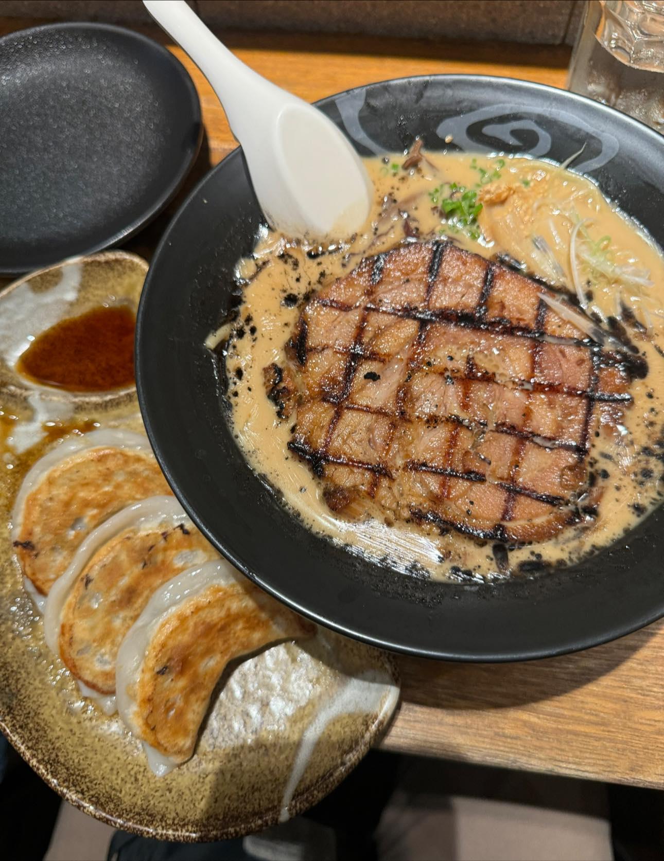 Tonkotsu ramen with thick, creamy broth and a big slab of grilled chashu. Smoky, rich, and super comforting. Gyoza on the side because why not.
