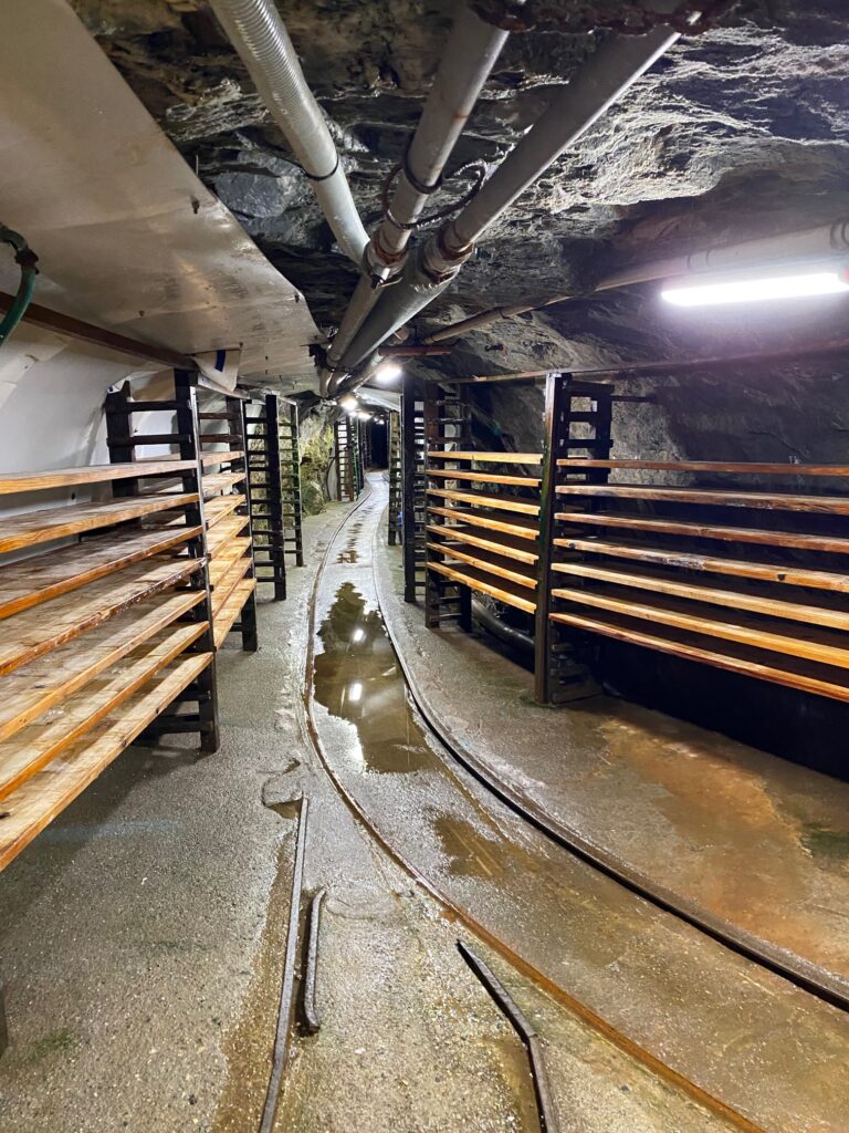 Thousands of cheese wheels are matured the Valpelline warehouse, built in the tunnels of a former copper mine. | Lucia Mackenzie/POLITICO.