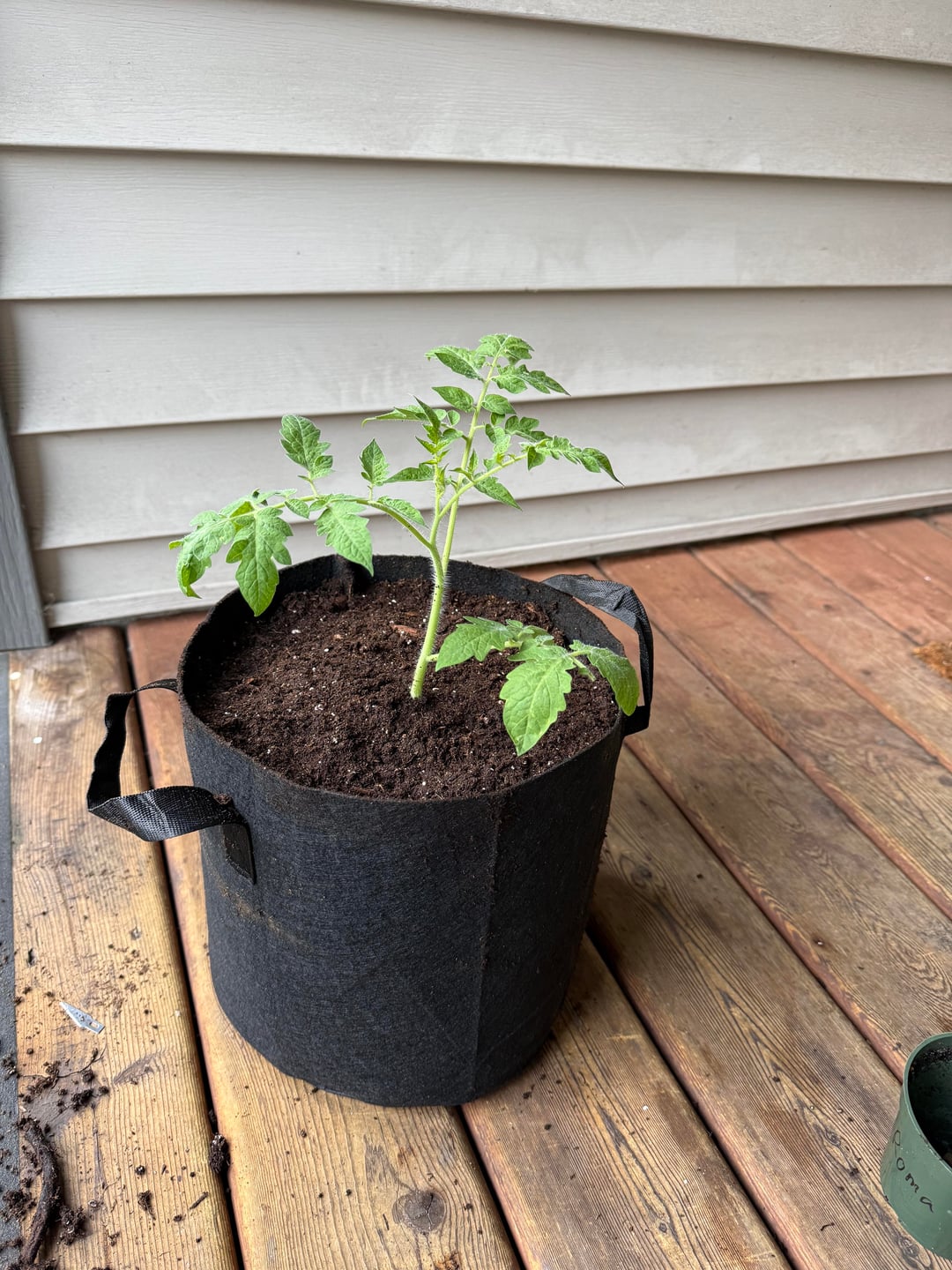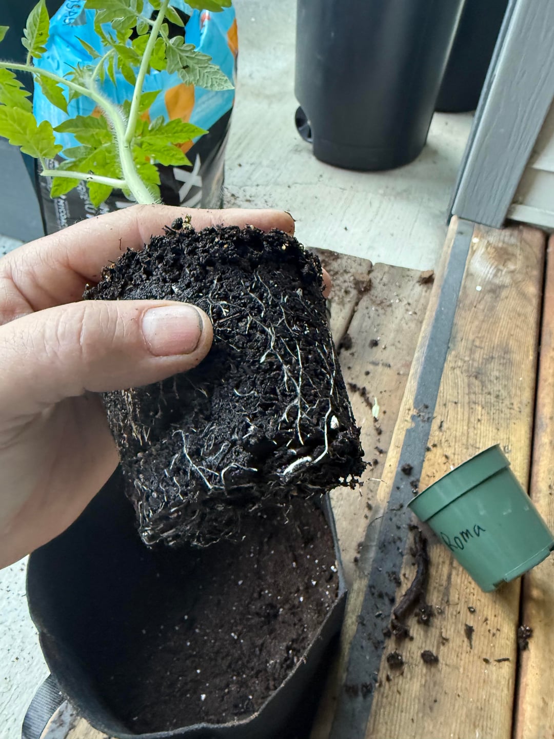 With tomatoes, my suggestion would be to plant them lower in the 5-gallon grow bags, then fill in soil as they grow. Then you won’t have to repot as often and they’ll start growing additional roots of the stems as you fill up the pot.