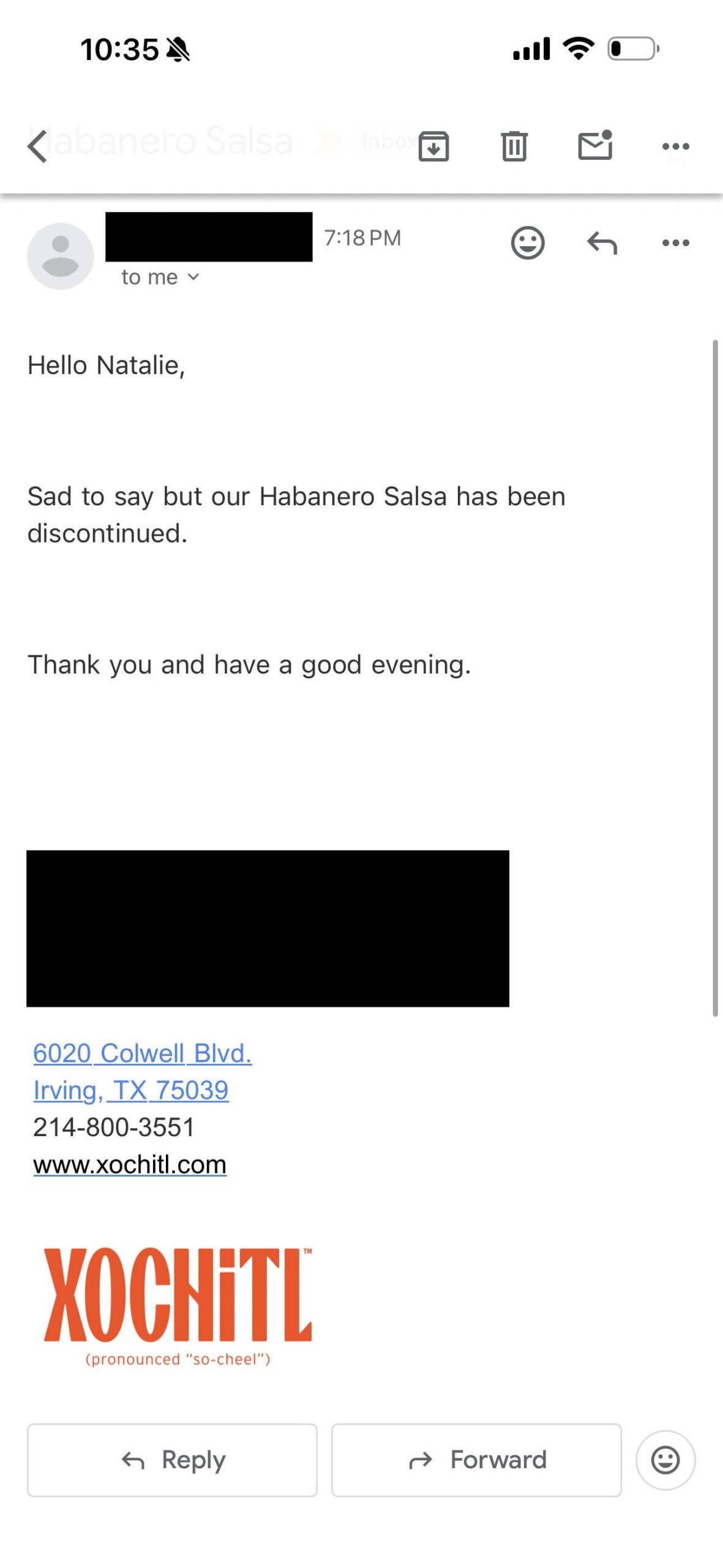 Hi all. I’m new here, but it was this group’s posts that had the only leads I could find in my lengthy search for Xochitl Habenero salsa. I used to buy it religiously, for the excellent flavor and the heat. I haven’t been able to find it the last few years. For the longest time, I had an old jar in my fridge with a meager bit of vinegary liquid at the bottom, caked residue around the edges, and I finally threw it out. Well I wish I hadn’t. In one of my habitual trips down the Xochitl rabbit hole a couple weeks ago, I came across a Reddit post that said I could order Habenero in bulk direct from the warehouse. I was hopeful, then when I tried, I couldn’t even find a reference to the Habenero salsa on their website. I soldiered through terrible UI to send a message to their Customer Service, and they got back to me today. Discontinued.