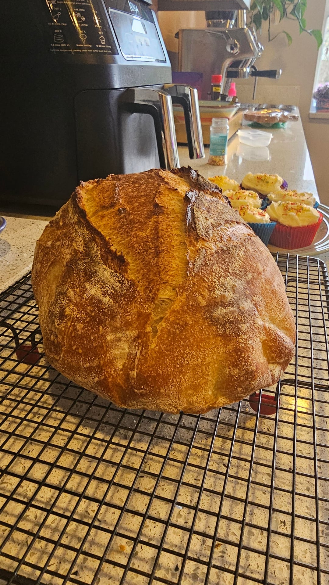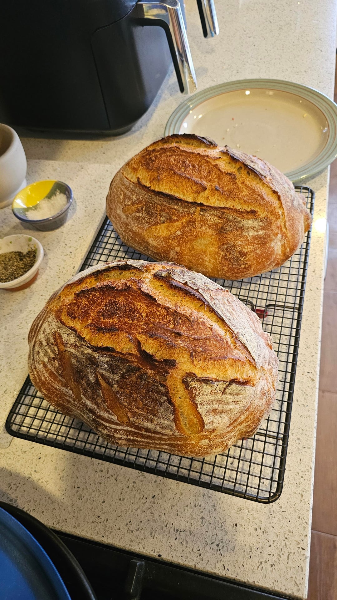 I did stretch and folds every hour, then let it cold ferment in the fridge overnight. Shaped them first thing this morning and let them proof on the counter all morning before baking in a Dutch oven. For the bake, I went 20 mins lid-on and about 15 mins lid-off to get that crust color.