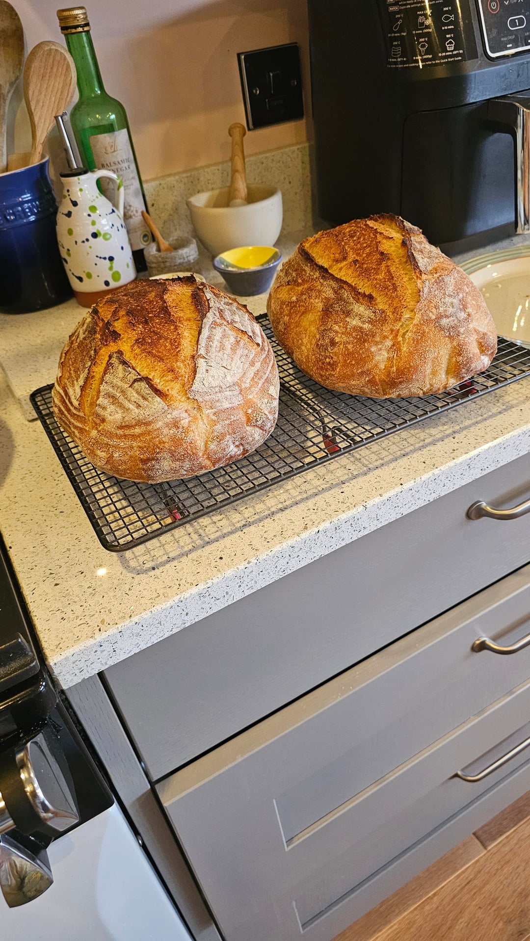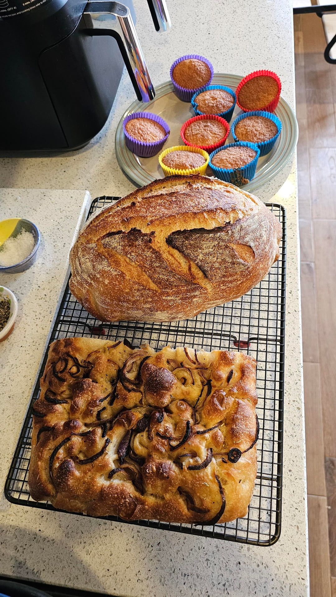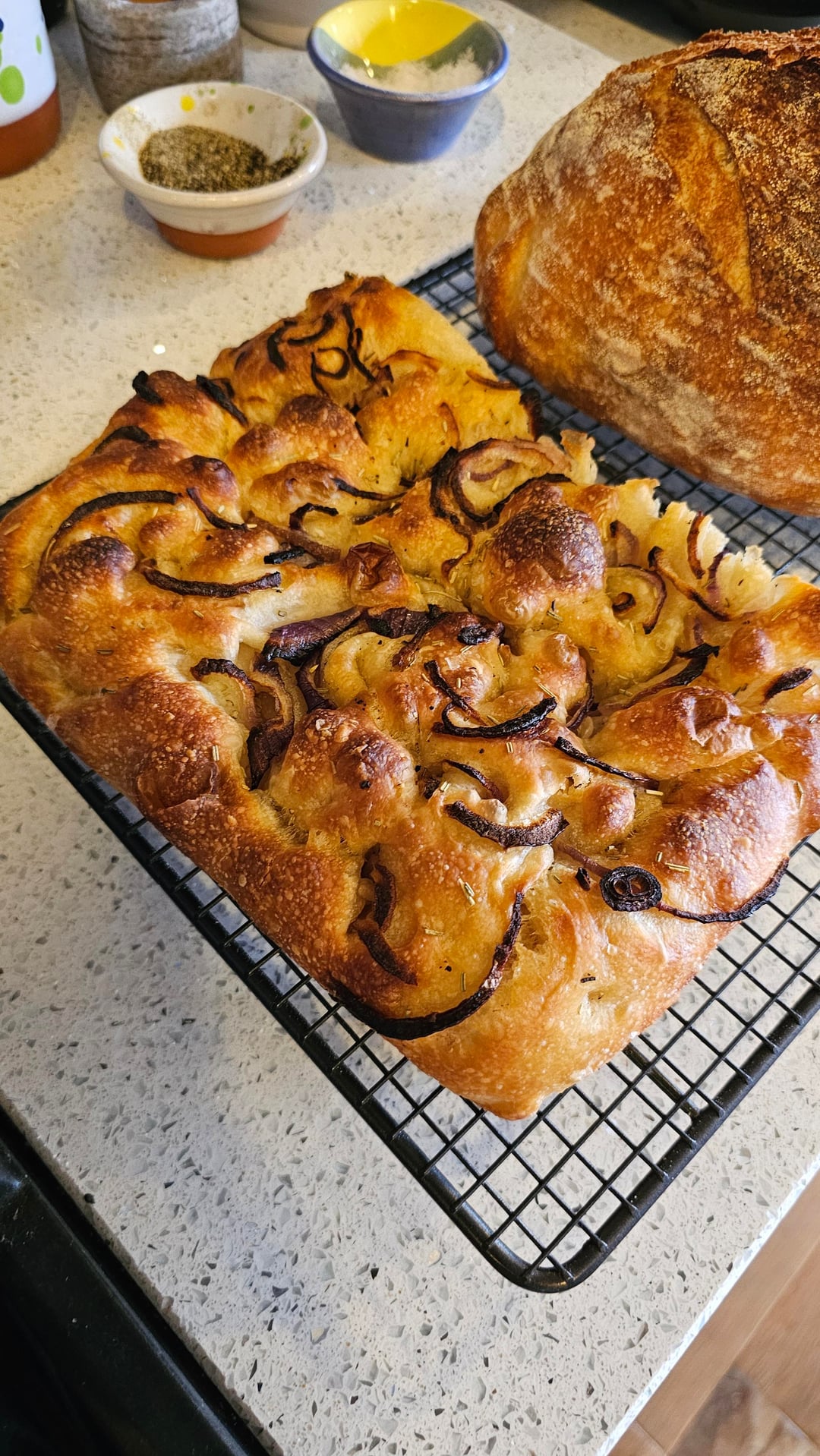 Just pulled these out of the oven and I'm pretty stoked with the results. I did two classic bloomers and a red onion focaccia—the smell in my kitchen right now is ridiculous.