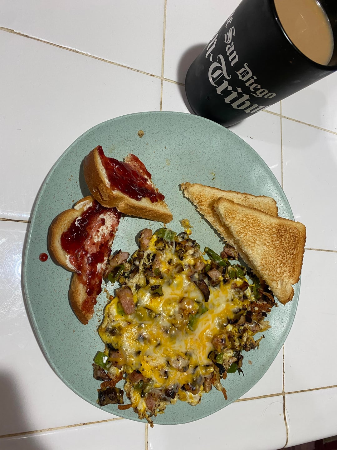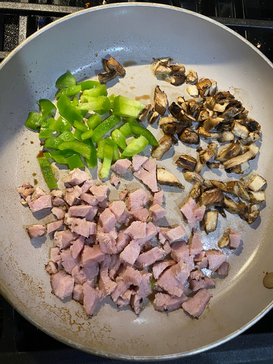 Sliced some ham I unfroze from Christmas time, added green peppers, mushrooms, and shredded cheese.