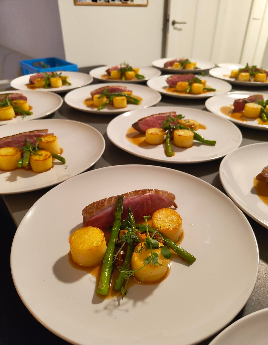 Smoked duck breast, potato fondant, green asparagus, cantharels and duck sauce