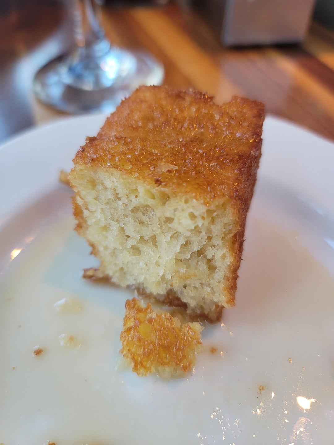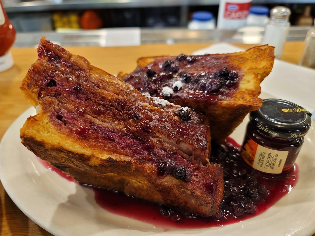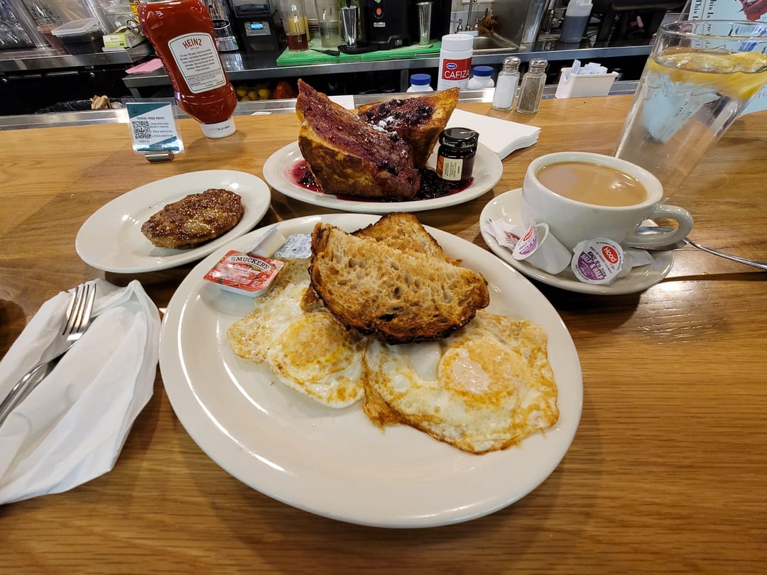 Over-medium eggs, sausage patty, toast, and lemon ricotta-stuffed French toast at Trident Booksellers & Cafe in Boston