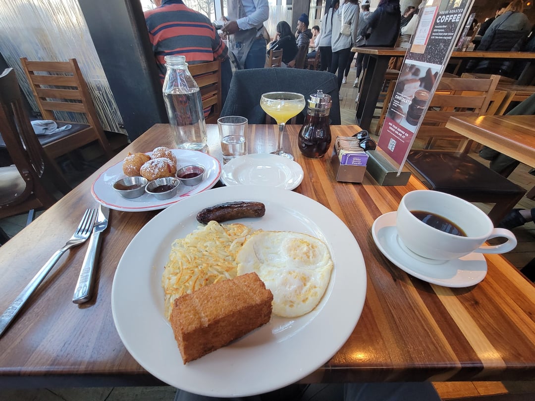 Over-medium eggs, sausage link, hash browns, brioche French toast, and beignets at Founding Farmers DC in Washington, D.C.