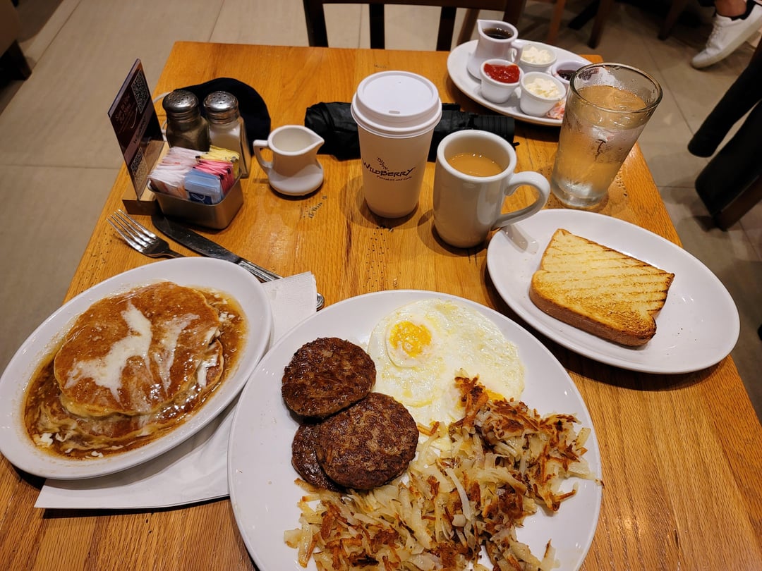 Over-medium eggs, sausage patties, hash browns, toast, and cinnamon roll pancakes at Wildberry Pancakes and Cafe in Chicago
