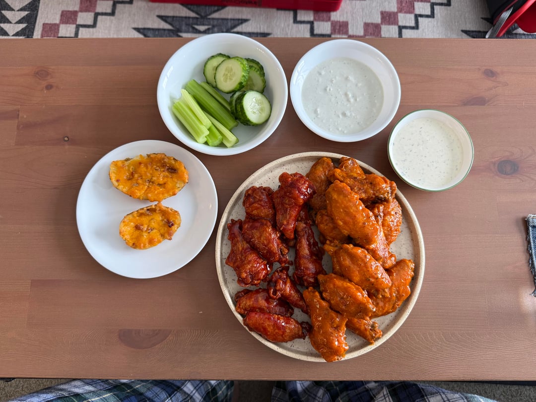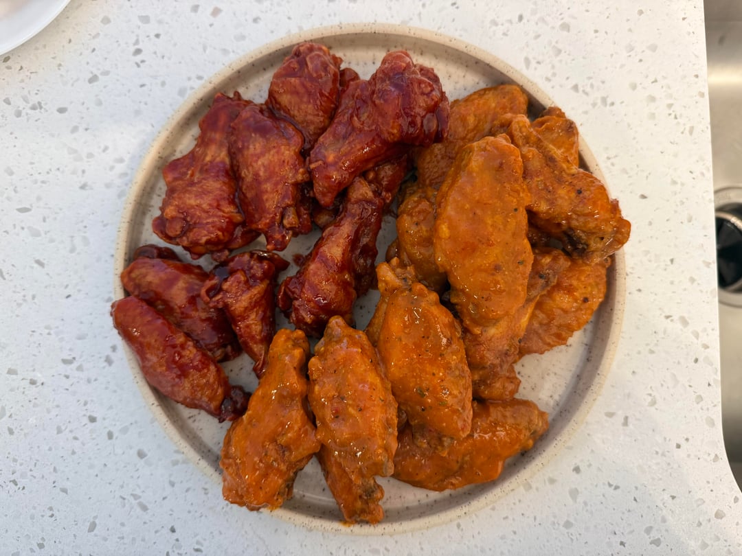 Used Kenji’s updated baked buffalo wing recipe (https://frienji.kenjilopezalt.com/posts/food-lab-recipe-121709152?synced=1). My favorite way to make wings! Made a homemade buffalo sauce, and used Buckeye BBQ from Quaker Steak and Lube.