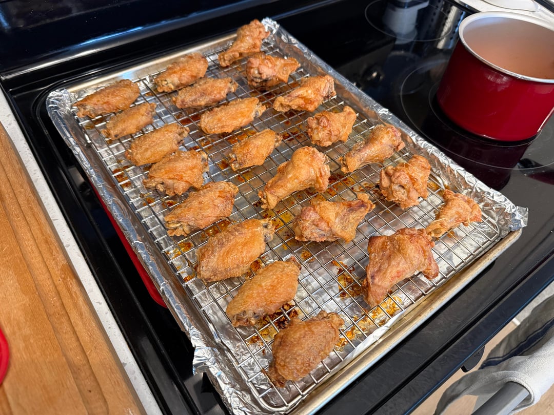 4. Looks good, I was inspired by his recipe too. Ive started just using corn starch, I don’t really miss the baking powder. And I only prep them a few hours early cus I can’t wait till the next day when I want wings.