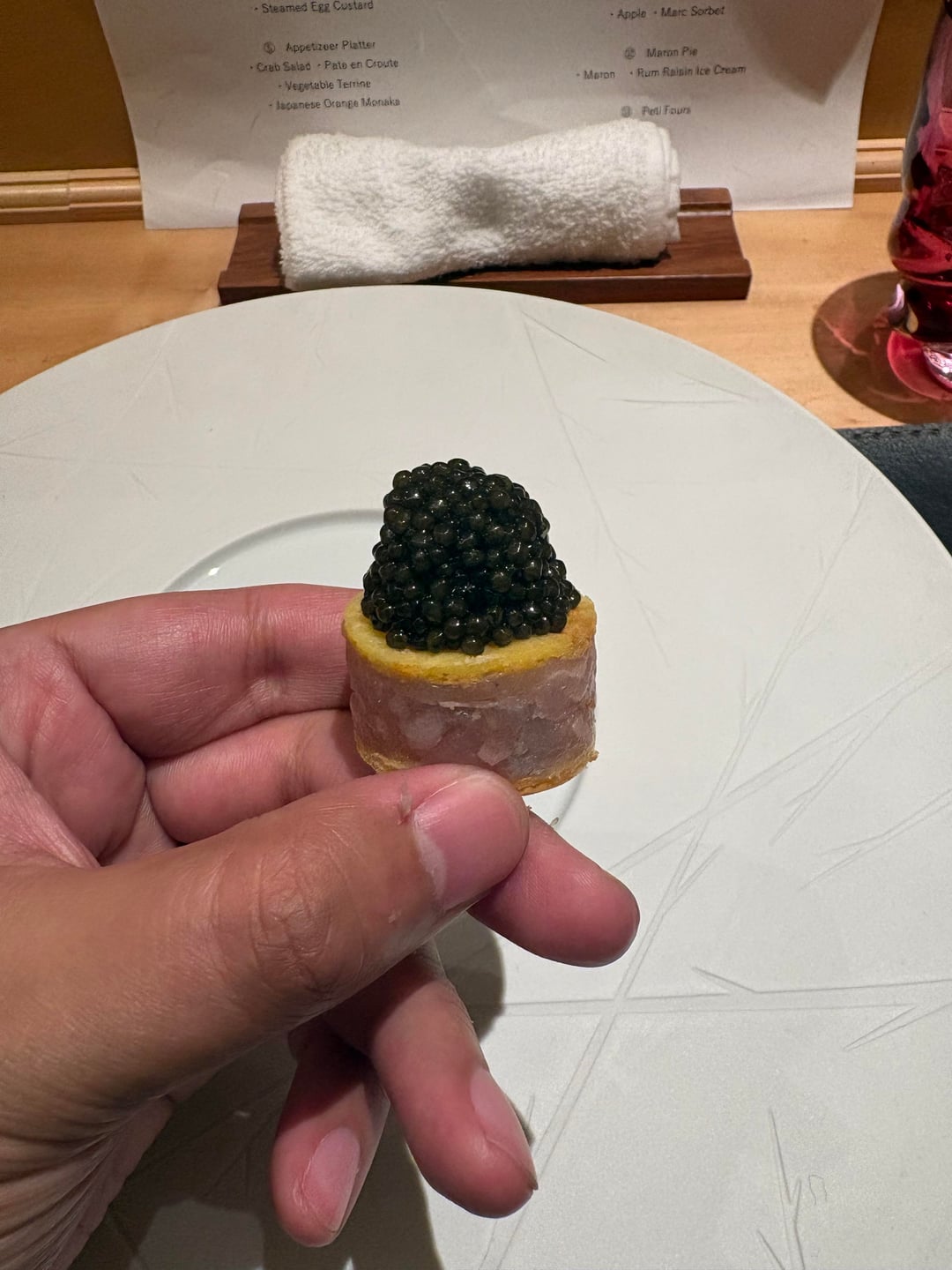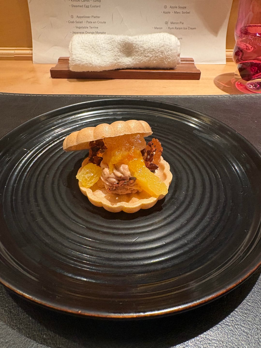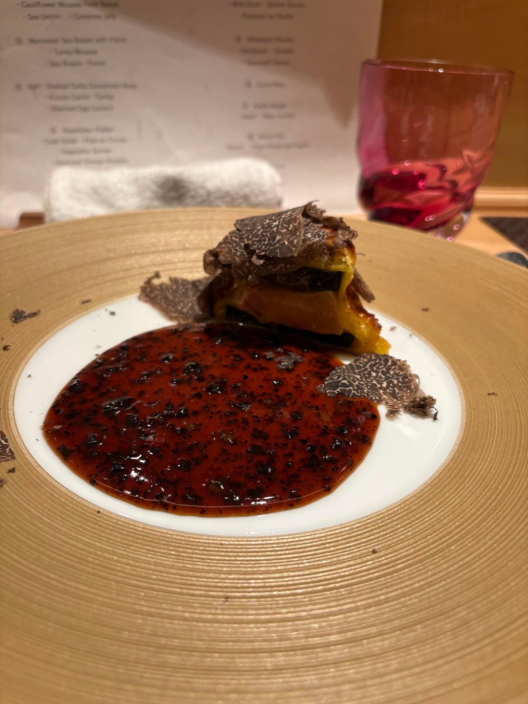 The “Oreo pie” (which I assume is a homage to one of Bernard Pacaud’s classic dishes?) was, to be frank, a dish where texture outweighed flavor: chewing on a solid block of truffle and root vegetables. I felt that using truffles more sparingly, as thin shavings, would have better highlighted their aroma. That said, the overall flavor of the dish was good: the layered combination of chunky truffle, shaved truffle, and sauce was certainly pleasurable. It simply didn’t exceed my expectations.