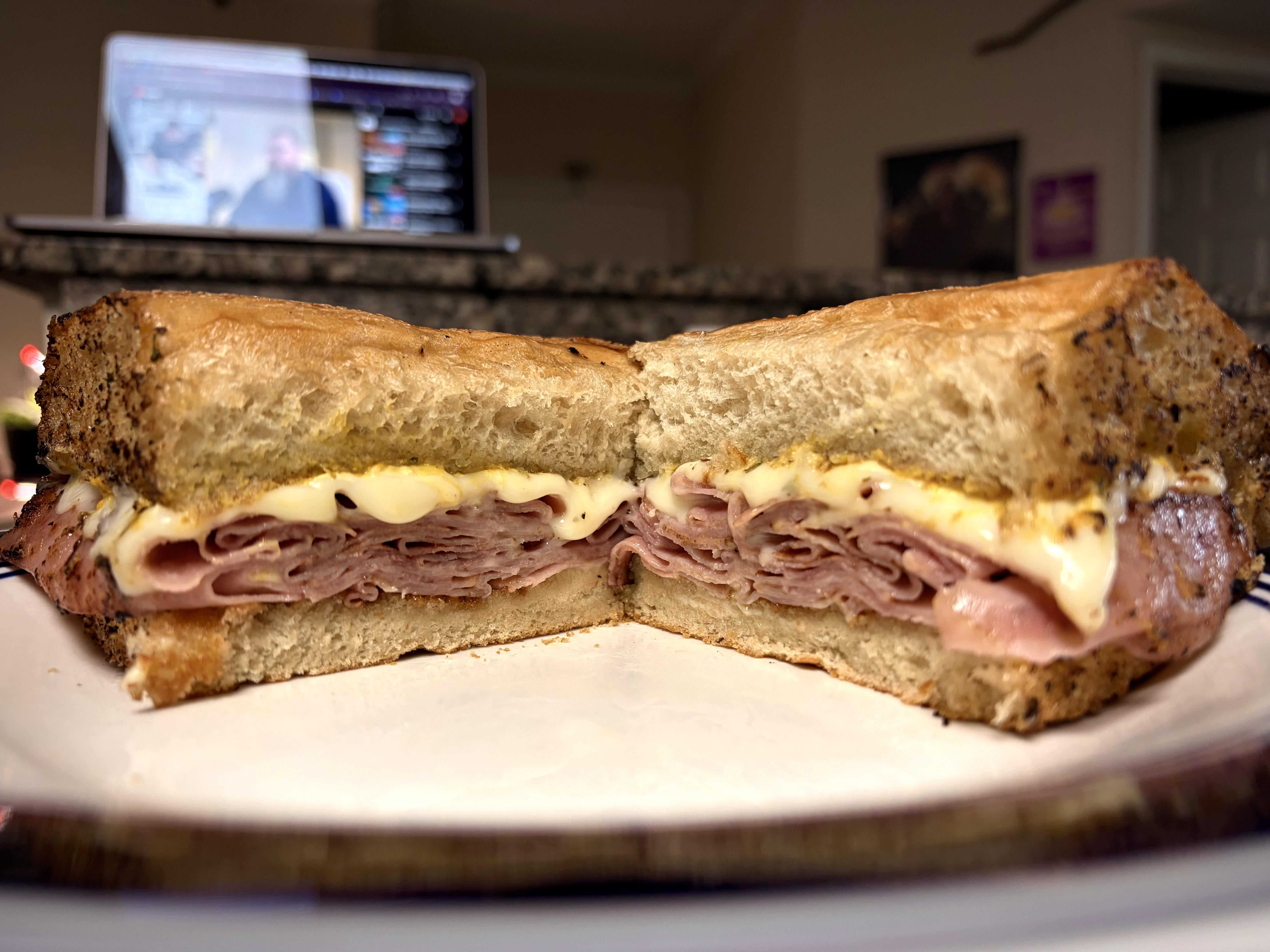Made one yesterday for lunch and it was so good I made another for dinner. Honey ham with white cheddar, dukes mayo and yellow mustard grilled on pan with garlic parm butter.