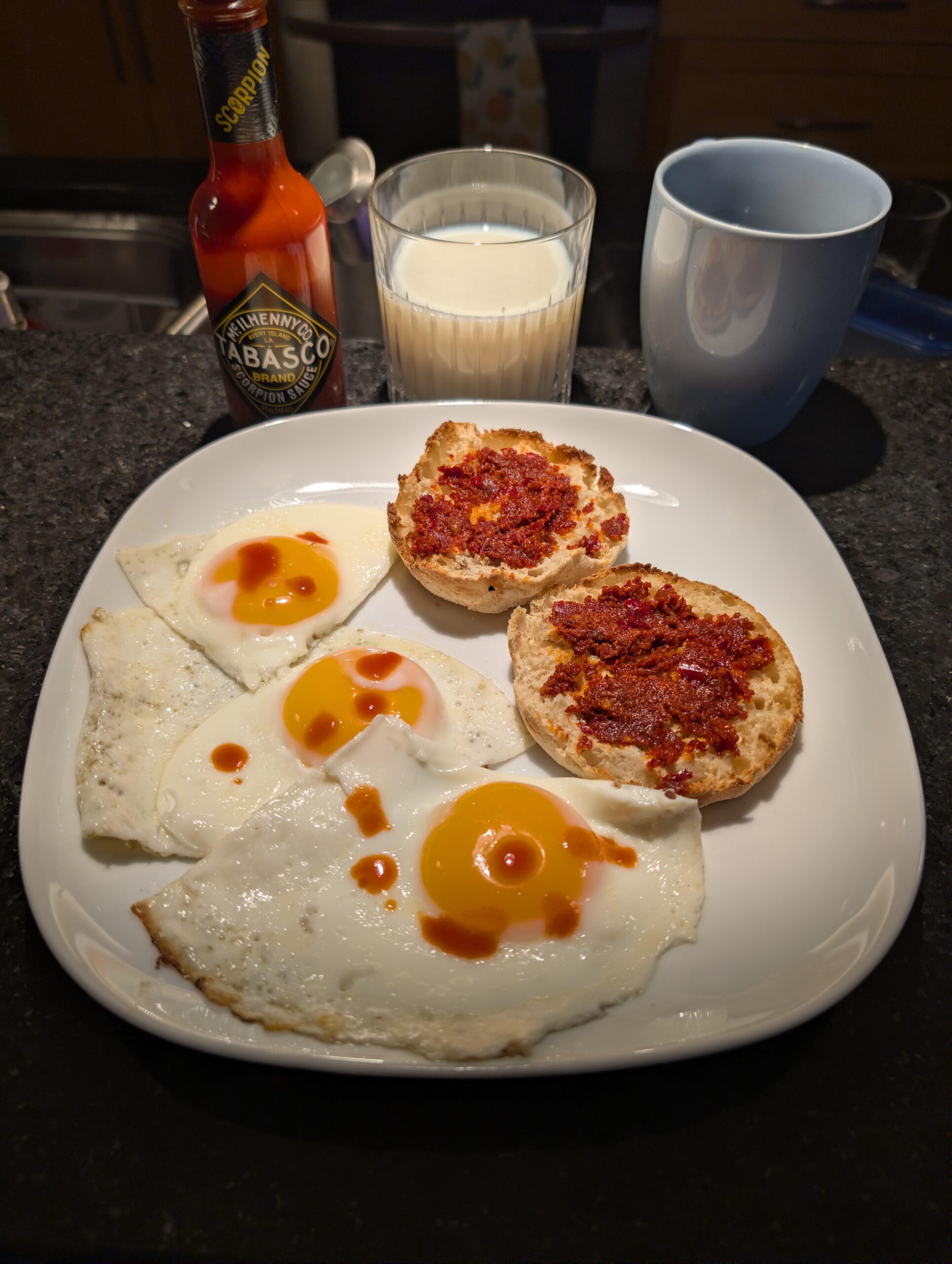 'Ndjua English muffins on the side. by Turvillain 3 Comments Usiris_23 3 days ago I start my breakfast with a milder sauce, save the real heat for lunch and dinner. OkIntroduction4660 3 days ago Looks awesome. I wouldn’t be surprised if those drops ended up cooking the eggs even more from the heat! Fuzzy_Welcome8348 3 days ago Looks great!