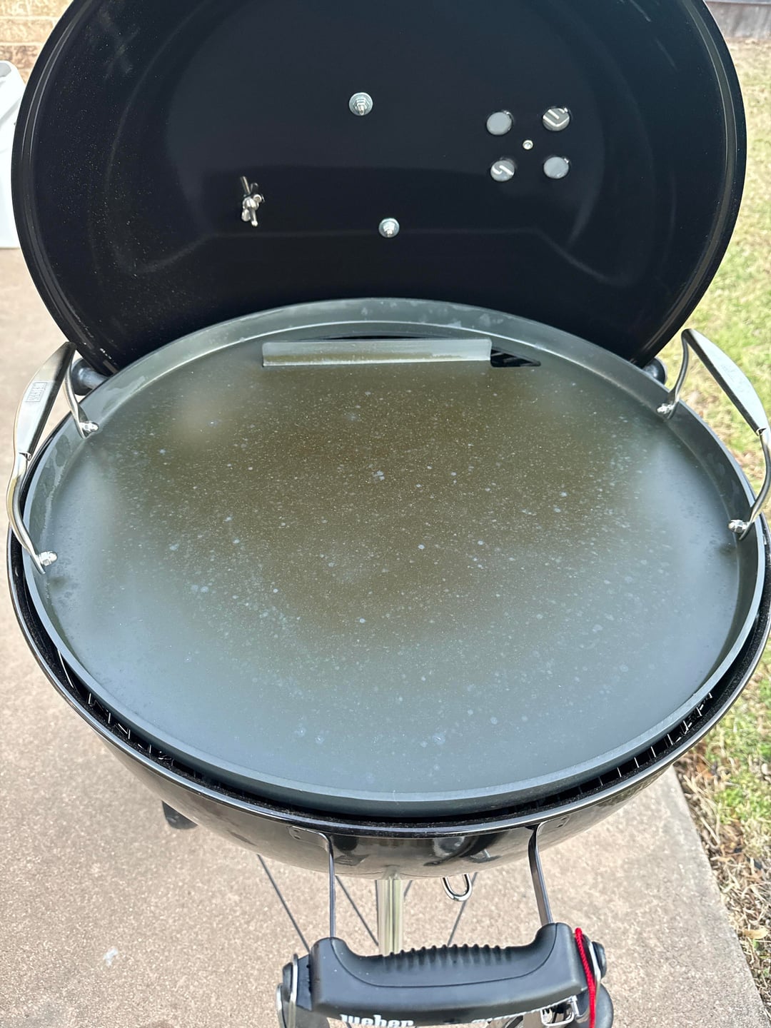 Did a burn off on my new Weber Kettle. Did I use too much oil? I’m hoping next time I heat this up I can just scrub the residue off the grates and the griddle will “even out” and lose the specs.