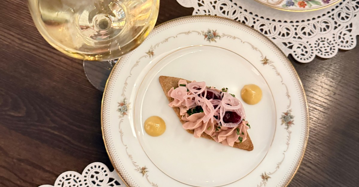 When did higher-end dining get so spartan and serious? Thankfully, that’s not the case at Bar Nouveau, which started as a pop-up and opened permanently in St. Johns in October. Here, maximalism and retro appeal are key. A wall near the entryway is plastered with pages from Mastering the Art of French Cooking, and thrifted gold candle sconces line the walls. Diners are greeted with thimble-sized welcome cocktails and eat off tea party-like floral-painted plates atop doilies. But the whimsy doesn’t stop there: At the end of your meal, the check comes tucked inside an old romance novel, a nod to chef Althea Grey Potter’s grandmother, who loved to read romance novels in the bathtub.