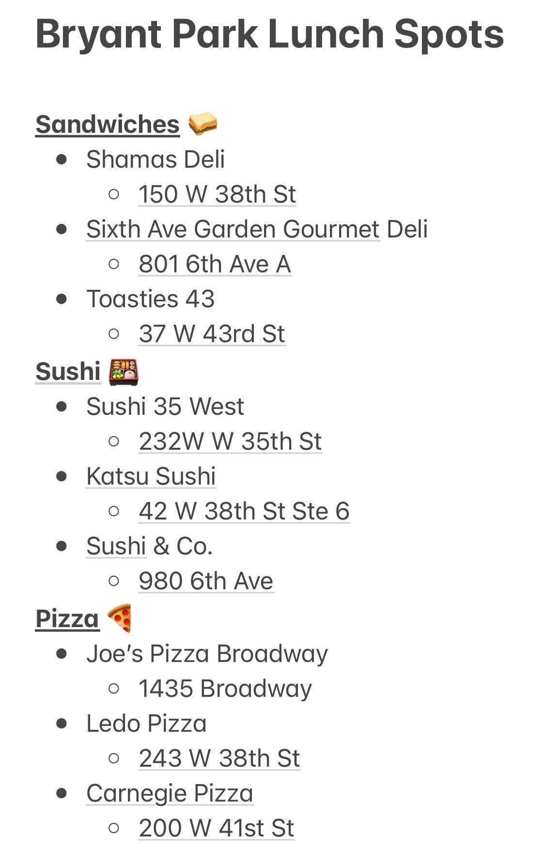 Just started new job in NYC. My office building is right next to Bryant Park (if you know where the Salesforce building is, right around there). Looking for some hidden gems for lunch options with the ability to take it to go and walkable (~10mins). Starting with Deli’s, Sushi, and Pizza. How’s my list? Good options? What would you add/remove? What other types of food are in the area that’s good lunch? Fresh ingredients and good portions. Thanks!!