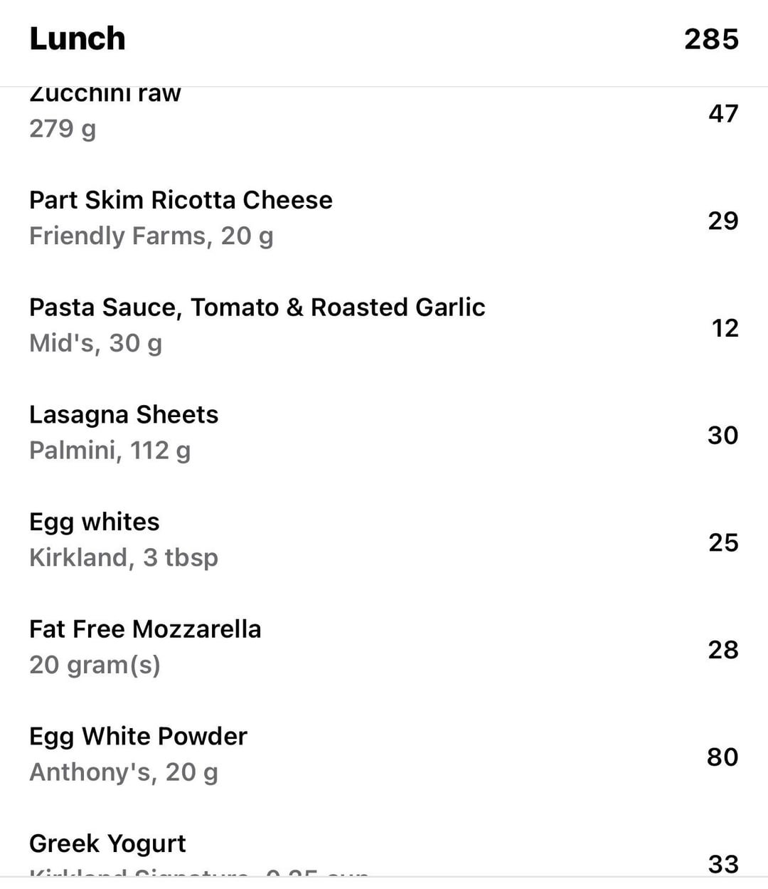 Took hearts of palm pasta lasagna sheets with zucchini and layered in a bit of ricotta cheese, egg whites and spices and then layered in marinara. Top with fat free mozzarella. Garlic bread is egg white dried powder with water, fold in Greek yogurt and garlic. Bake 350 for 45 min