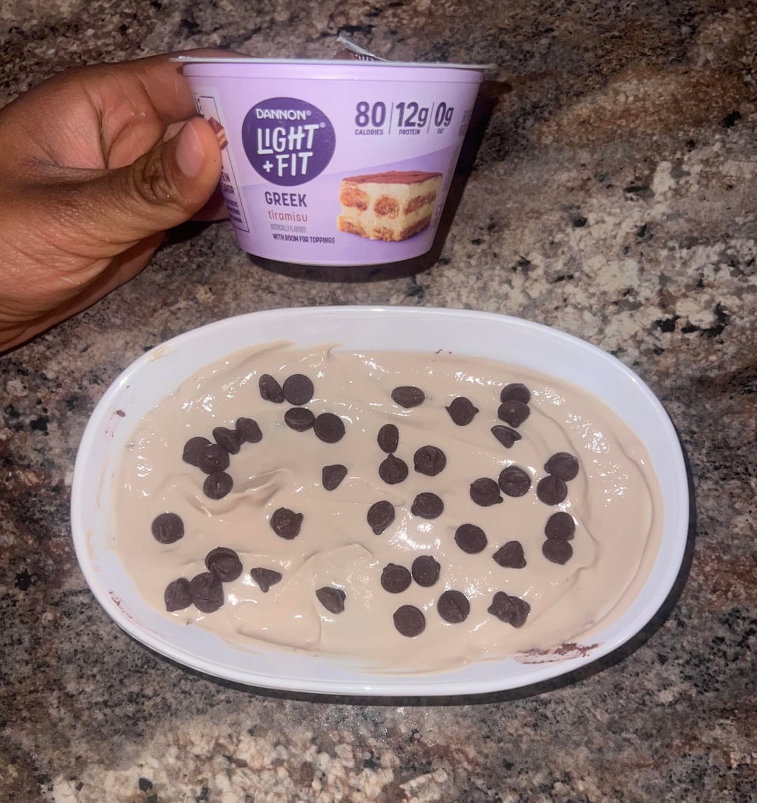 Topped with Dannon light & fit tiramisu yogurt & Lilly’s sugar free chocolate chips – 230 Cals