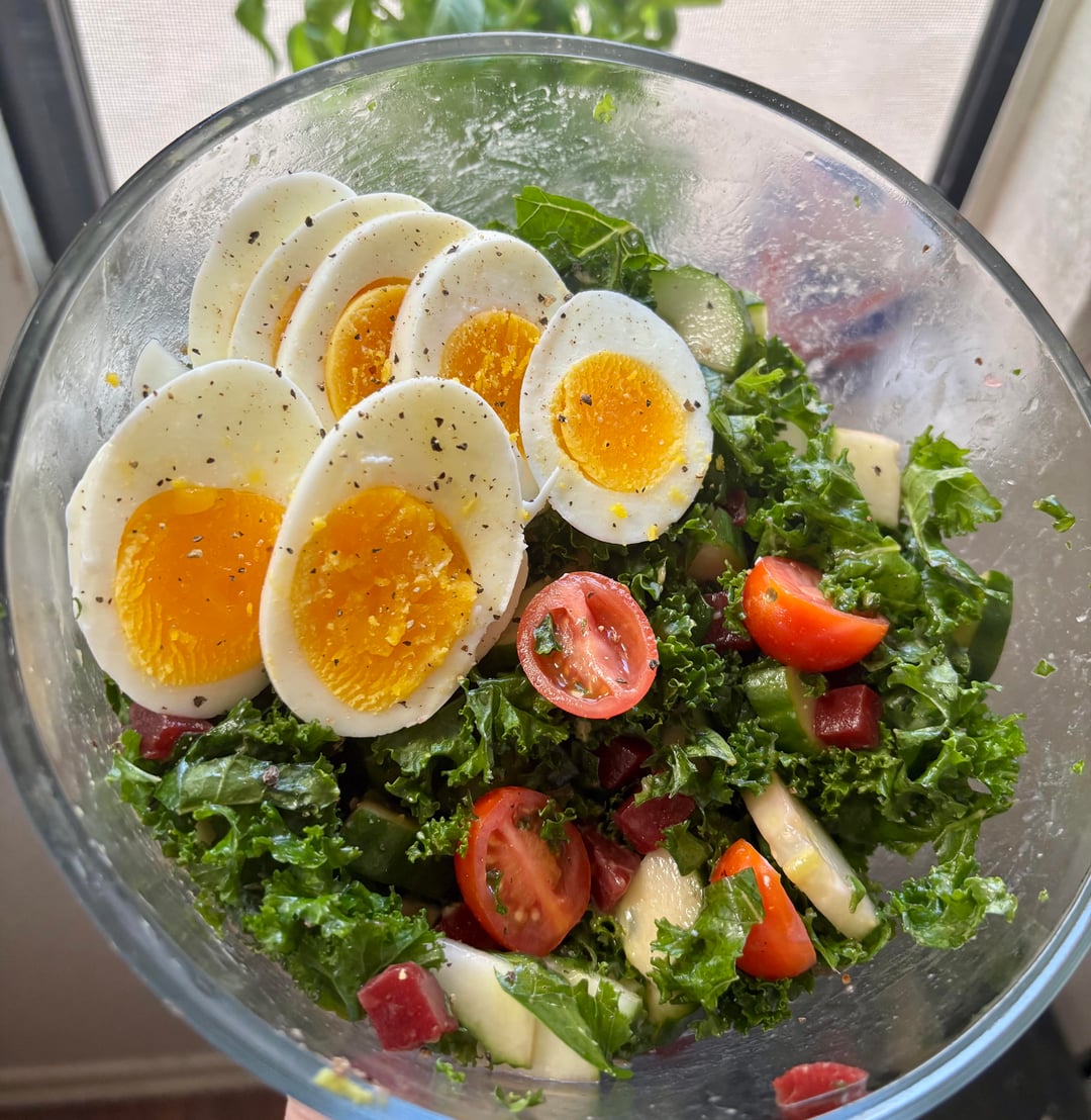 Been feeling very unhealthy lately, so I made a huge salad. No dressing, but I spritzed olive oil on the kale to massage it, topped it with black garlic salt.