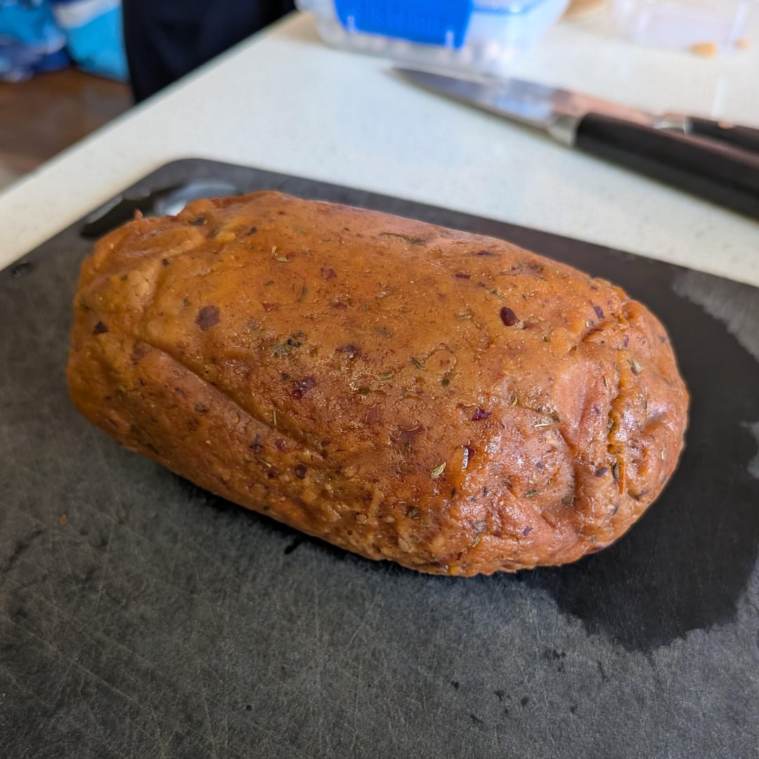 Used 1 cup VWG; half a can of chili beans blended with soy sauce and minced garlic. Nutritional yeast, a tablespoon of apple cider vinegar, thyme, paprika, oregano. Wrapped the log in foil and cooked on high for 45 + 10 in the instant pot.