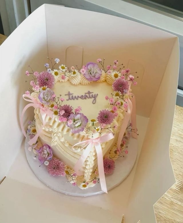 The baker clearly doesn’t feel comfortable writing on the cake like the inspo, but then they did a terrible job of applying the printed script. The cake isn’t heart-shaped. The flowers are a mess and I’m concerned about food safety for the flowers on both cakes tbh. There’s no ribbons which is a prominent feature of the inspo design. Idk if you got any special fillings or anything, but there’s really not much that could make me think this cake is worth that price.