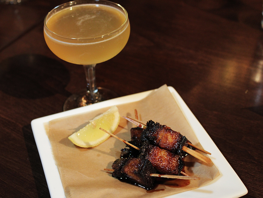Harley Sidecar (rye whiskey, Cointreau, lemon, Demerara, Islay scotch float) and Glazed Pork Belly Skewers (sweet mulling spice and umami reduction): “The smokiness of the Islay scotch float in the Harley Sidecar goes really well with the pork belly. The pork belly is cooked in a three-day process. It’s marinated and braised for a few days, we use all different types of techniques to make it nice and buttery and melt in your mouth. It’s got a nice smokey flavor to it.”