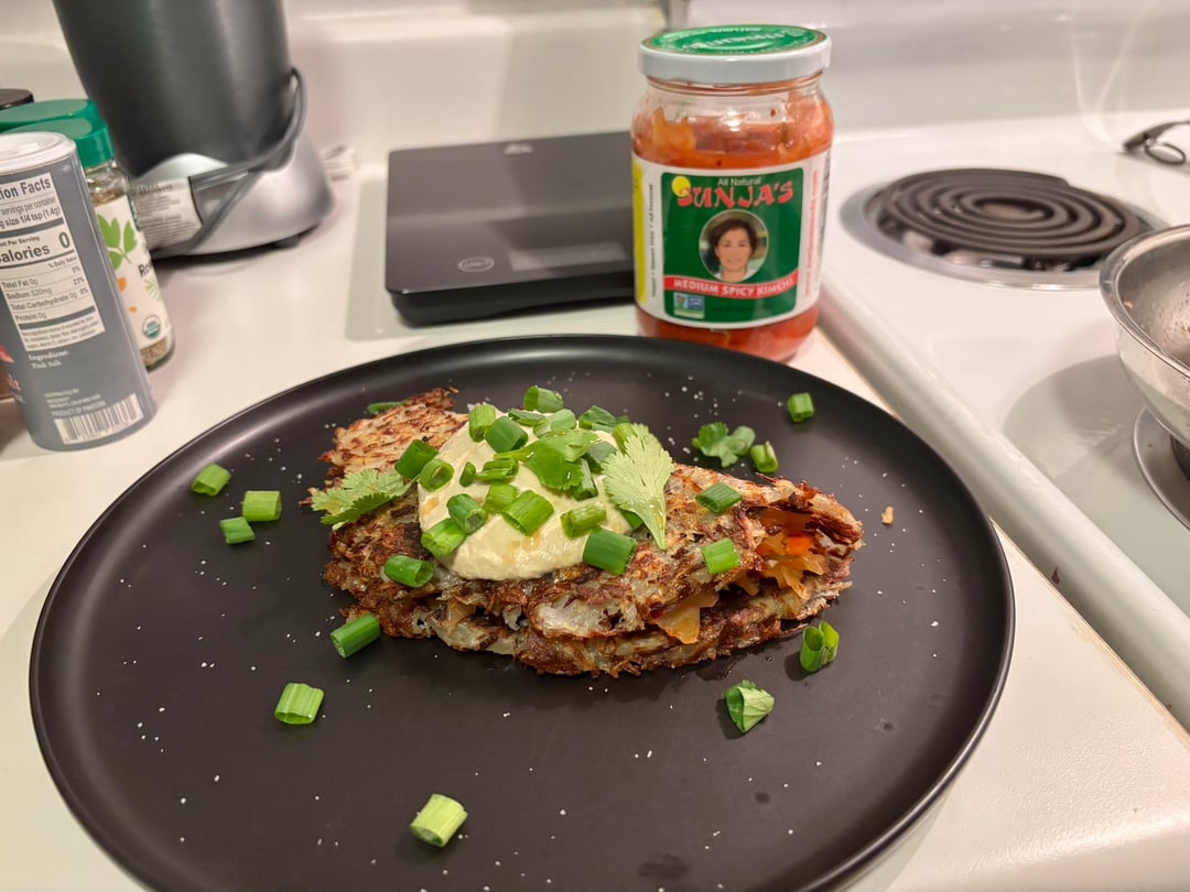 Breakfast for dinner. Hash brown omelet with kimchi and homemade vegan cream sauceby fitsomah 1 Comment Fuzzy_Welcome8348 2 months ago Looks tasty! 😋