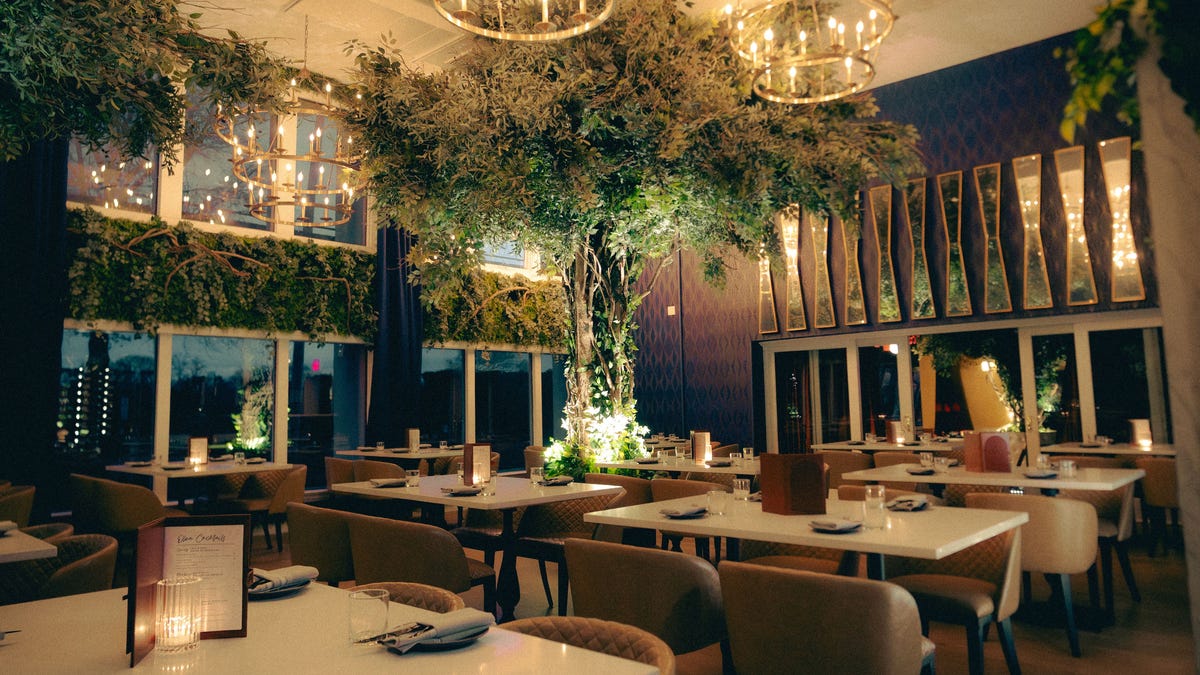 Pass through a polished and gleaming lobby and bar to dining areas filled with red velvet curtains, cream-colored leather seating, chandeliers, candlelight and a fireplace. In the main dining room, take a seat beneath a floor-to-ceiling olive tree, its branches covering the walls.