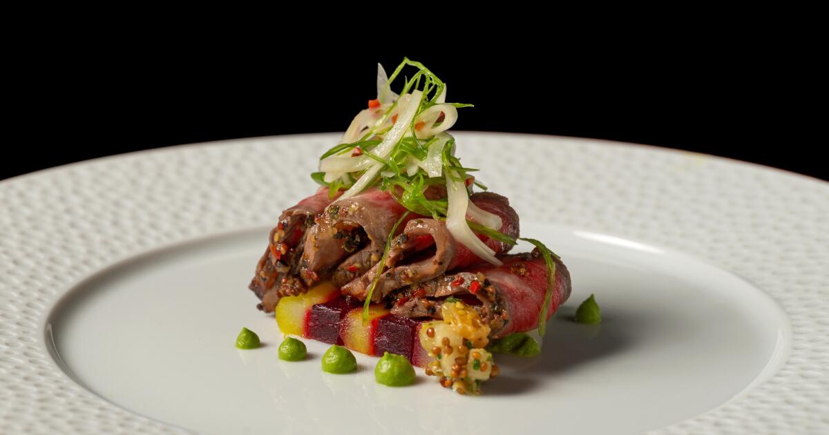 There are multiple options for each course and the menu leans on seasonality as much as technique. A first course option of sautéed seasonal fish (hiramasa on a recent night) is accompanied by avocado relish and puffs of lemon foam. A third course option of house-made sorpresine pasta features a rich broth made from California Dungeness crab and butter of Pacific uni. For dessert, a Valrhona chocolate bar is filled with hazelnut praline and caramel, sweet and crackly, like the childhood treat its name evokes.