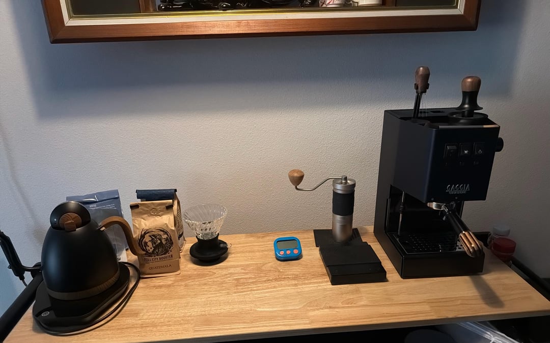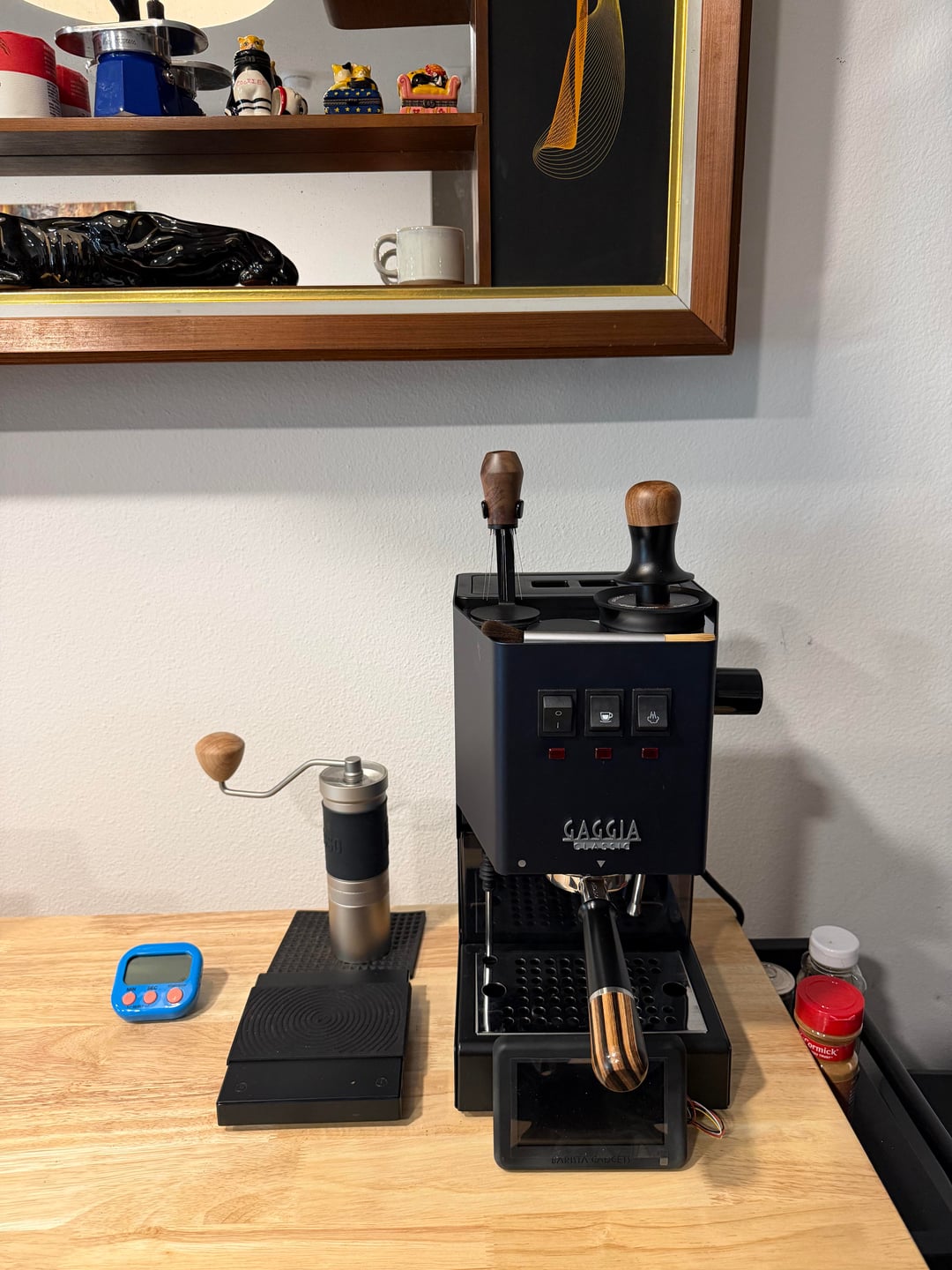 Just got my Gaggia E24 three weeks ago and have been slowly building up a cozy station. Before that I was just using my Jx pro and hario switch with a brewista pro kettle Can’t wait to mod it with the crematune v2. Still need to get a tamping station and some bean containers. Any recommendations for them?