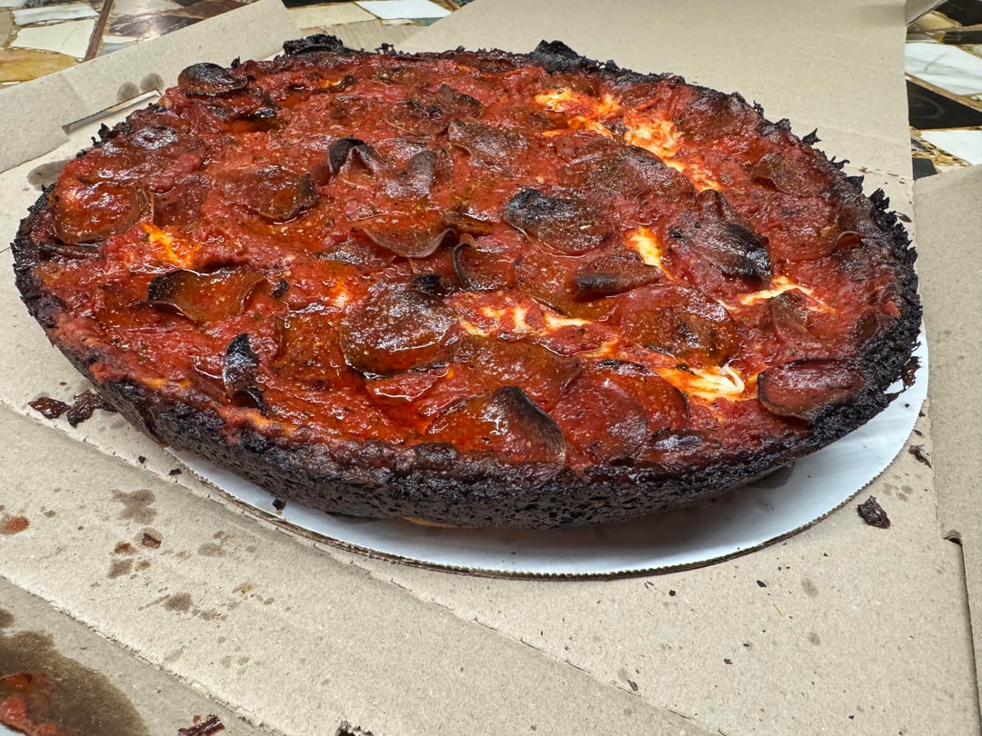 I think there is just some kind of gaslighting that everyone buys into with this Pequods pizza where we all pretend that burnt to fucking Hell and back is actually just “dark caramelization.” 🤷‍♂️ 😂