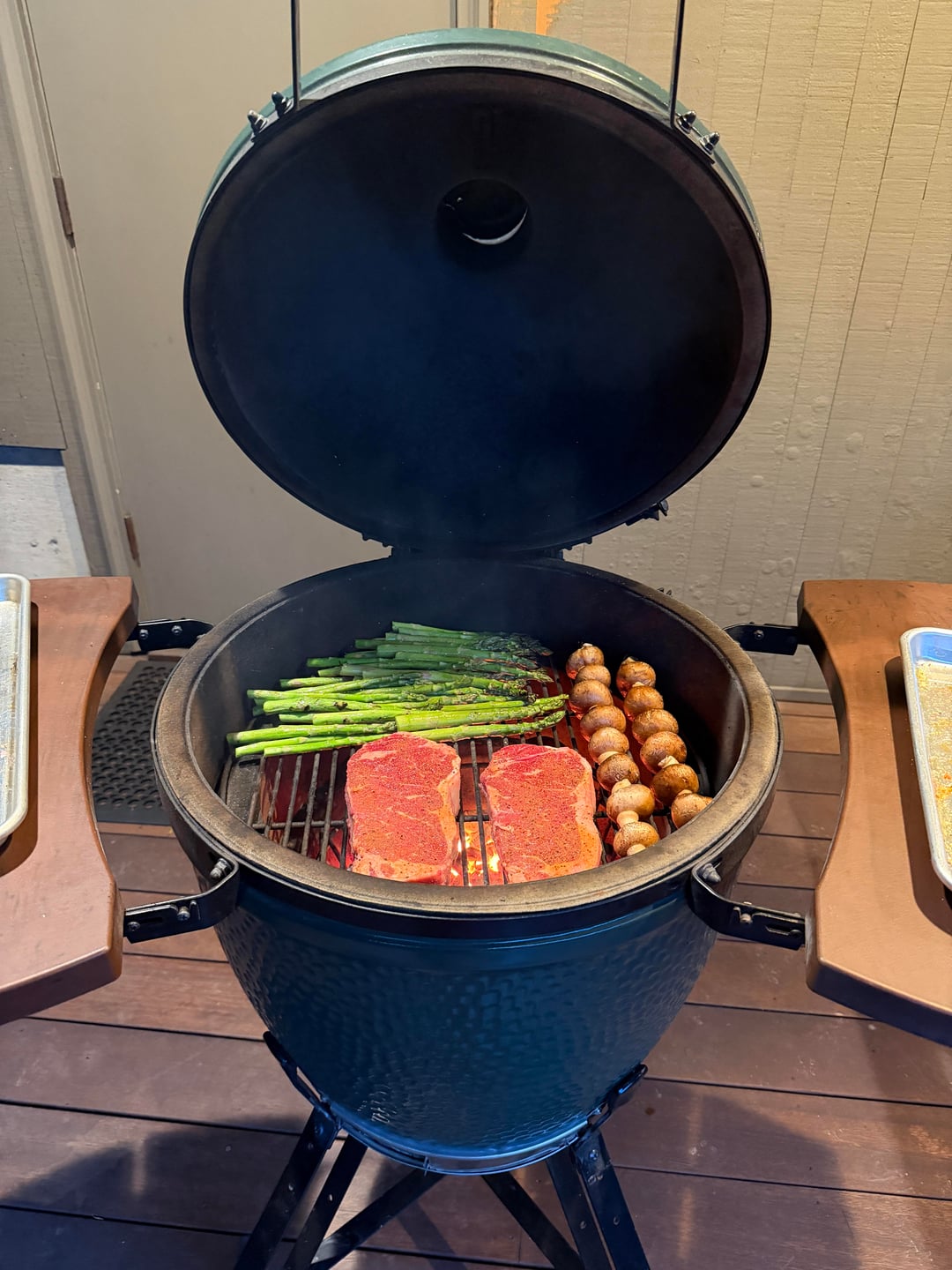 Just picked up my BGE today and attempted dinner. Great flavor, but wish the fat would’ve rendered a bit more. I accept the challenge of perfecting the temp on this beautiful grill.by 2Cheesey Dining and Cooking