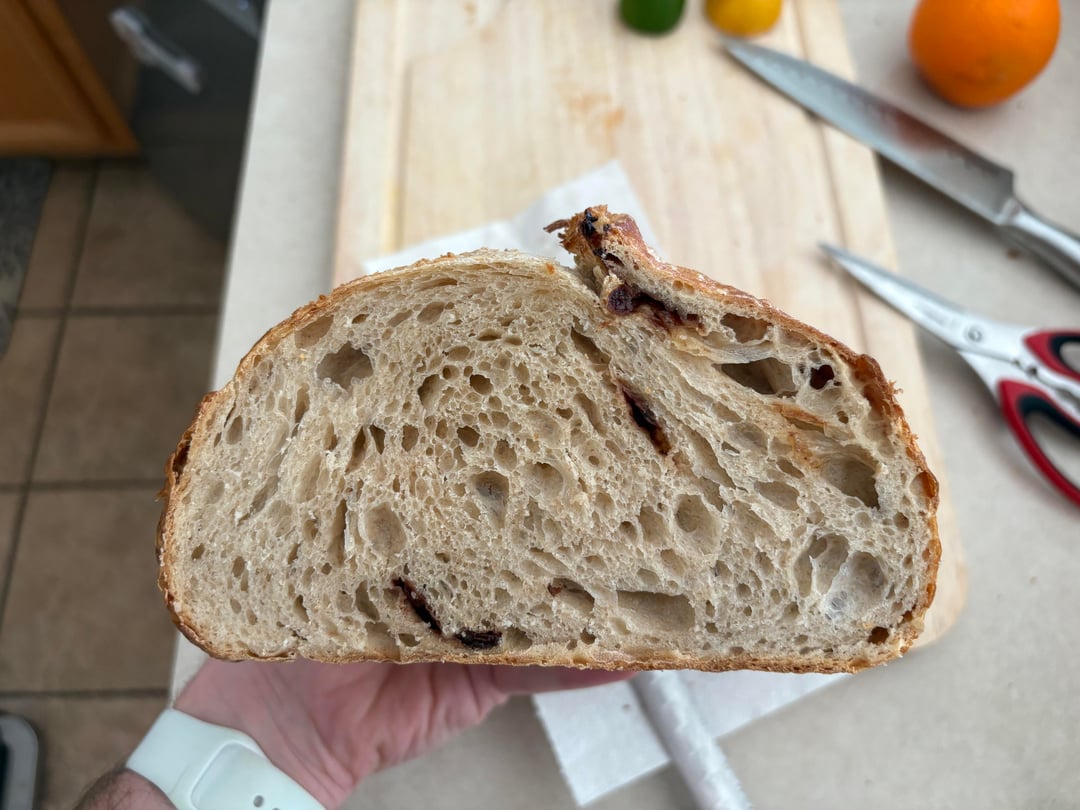 On a whim, I added dried sweetened cherries to two of the whole wheat loaves at the shaping phase.