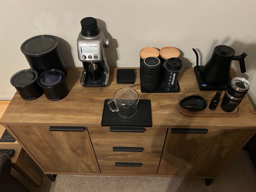 Most days I’m making a coffee with aeropress. Modified Sage/Breville smart grinder pro for single dose grinding.