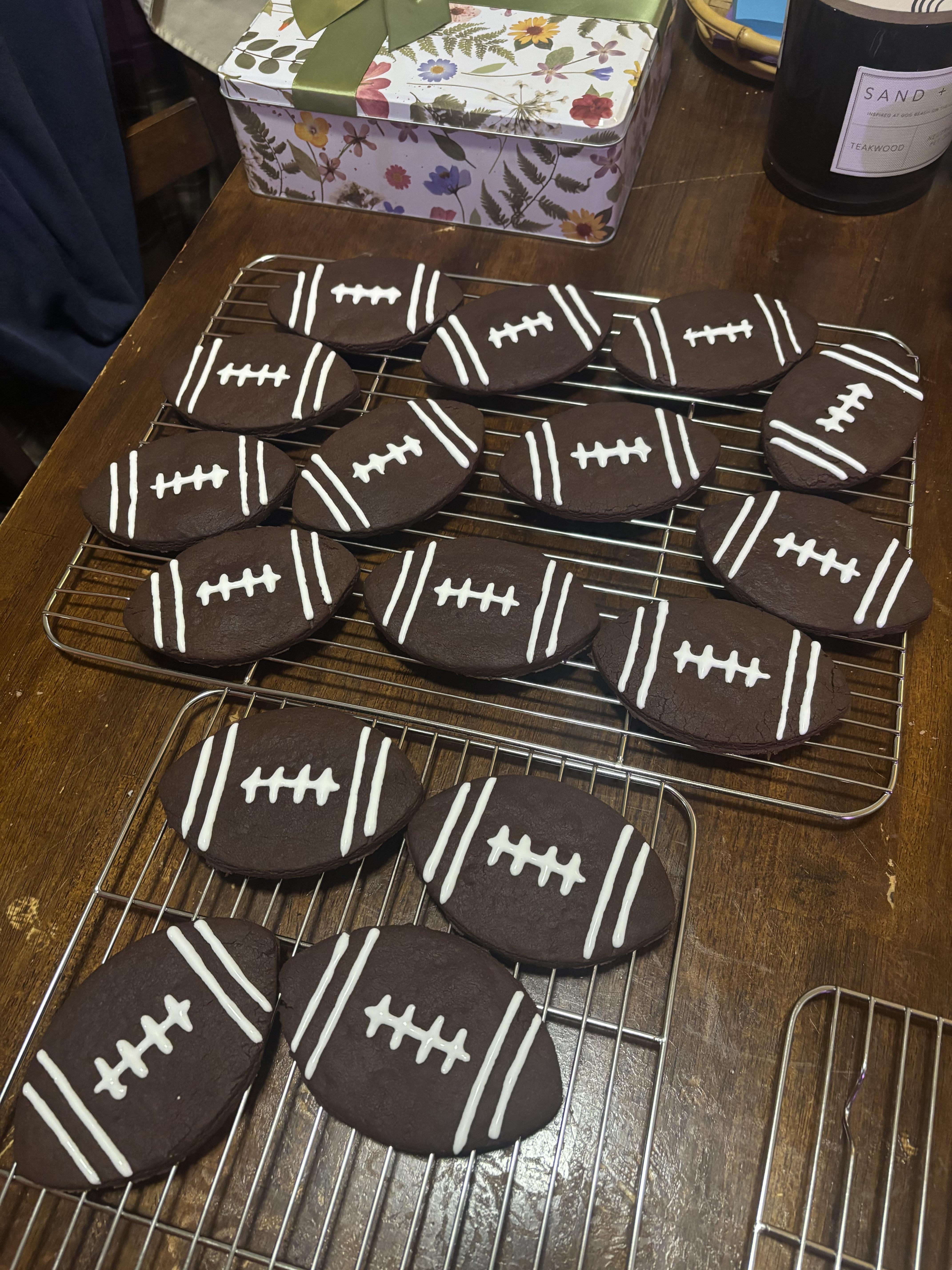 made these cookies for a superbowl party we are having tomorrow ♥️🏈 definitely need to practice this recipe more to avoid the cracking/rough edges on the cookies and find a better icing tip to avoid all the overflow in the middle but other than that, I am pretty happy with the results!