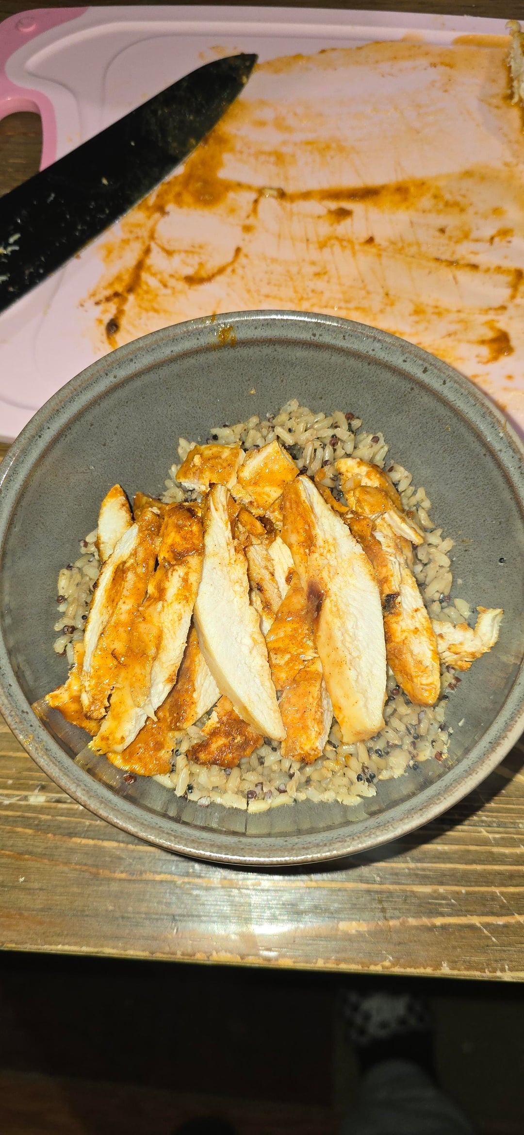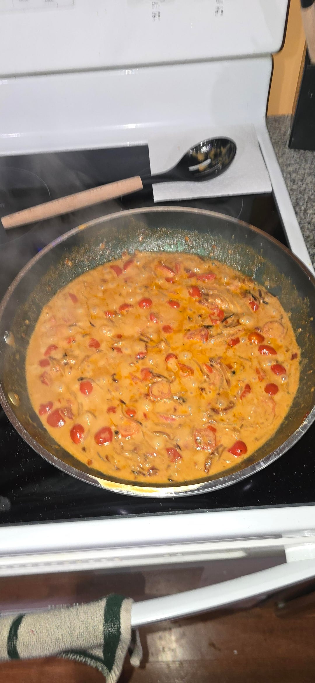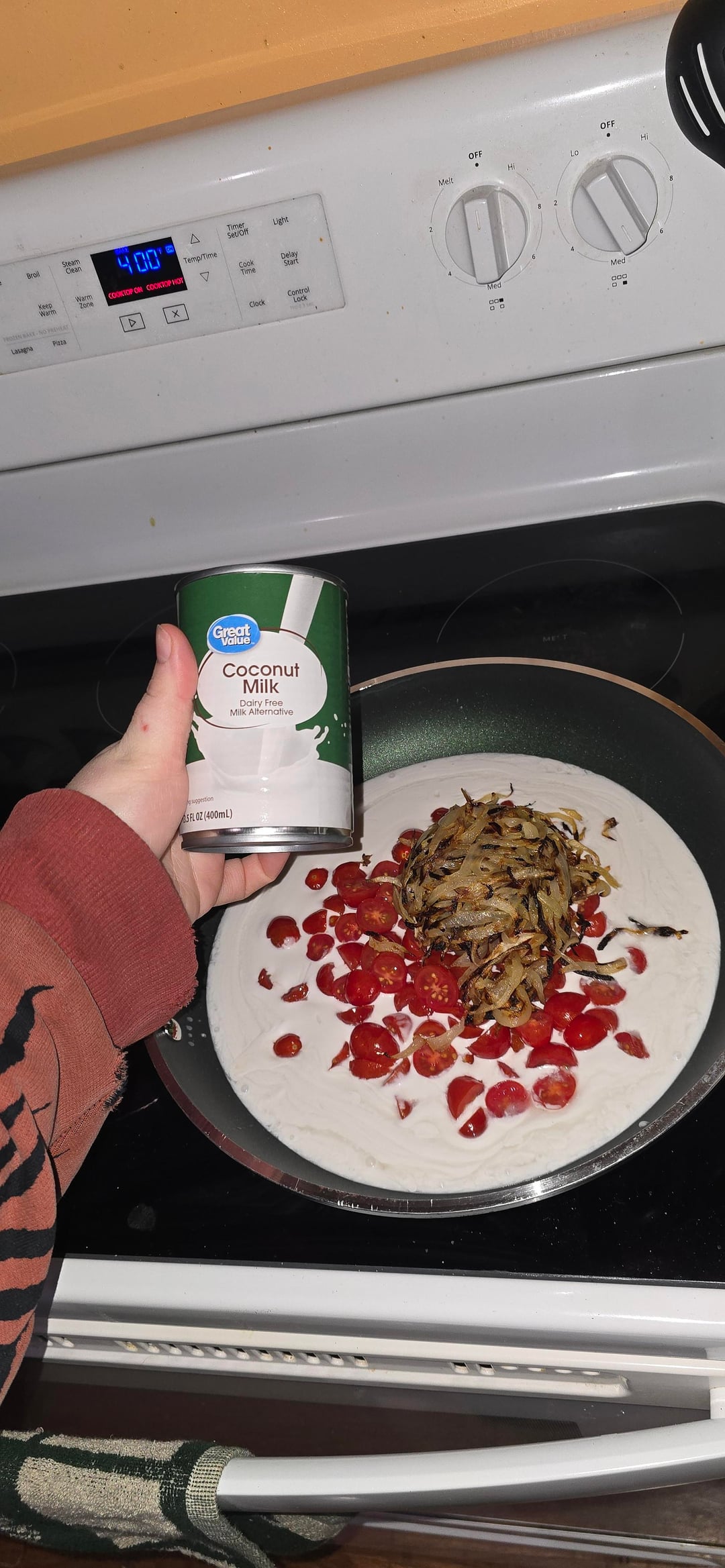 this isb reallt good seasoned chicken with salt pepper paprika onion powder garlic piwder cut cherry tomatoes i. half and simmeree with coconut milj and carmeluzed onios for about 30 misn added salt and garlic pedr to the simmering sauce. had filet chicken breast from a few months ago frozen so i thawed thennt baked in the oven at 400 for 13 mins they were like 1/2 in thick. gad brown rice and quinao packets in the panrty so i uded that as base and it sreally yummy i thinknmy bf will like it a lot. hopefull. :3 ask questions if u wanan make it
