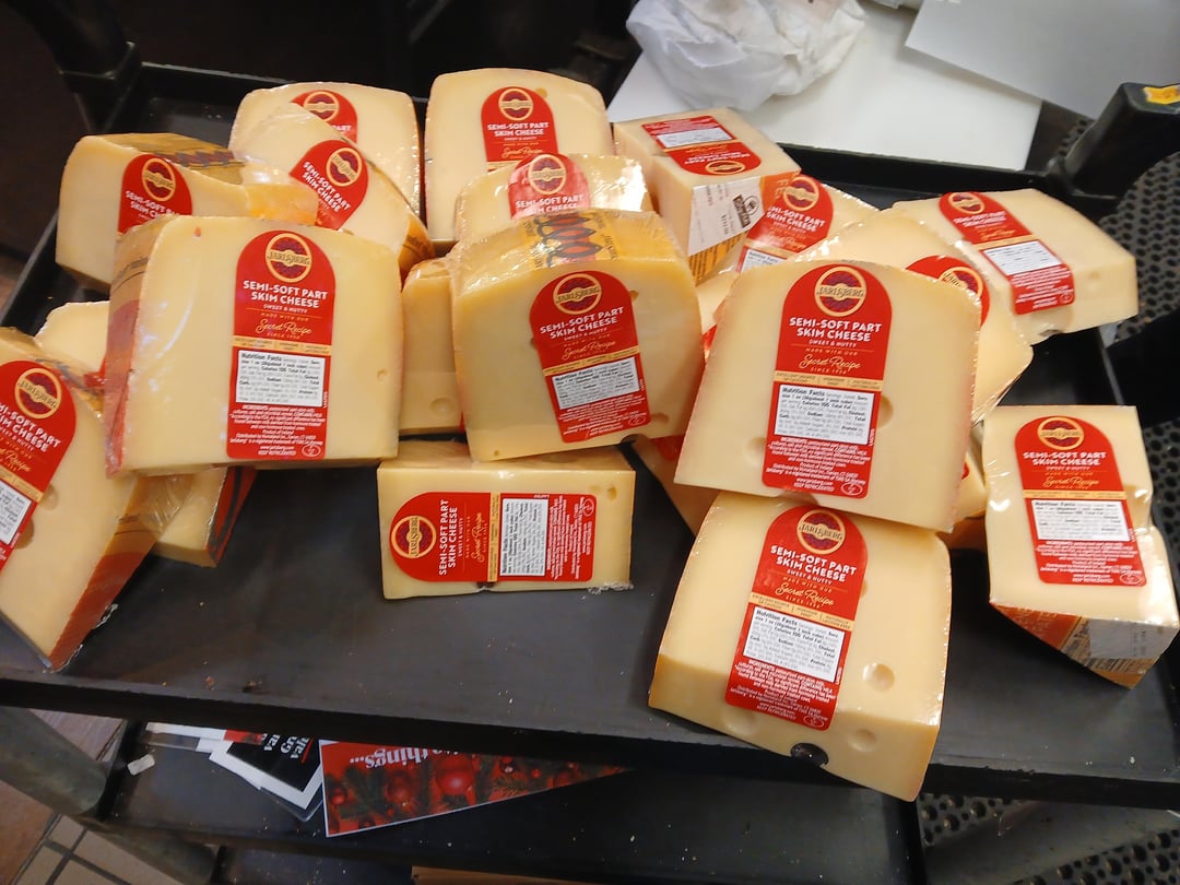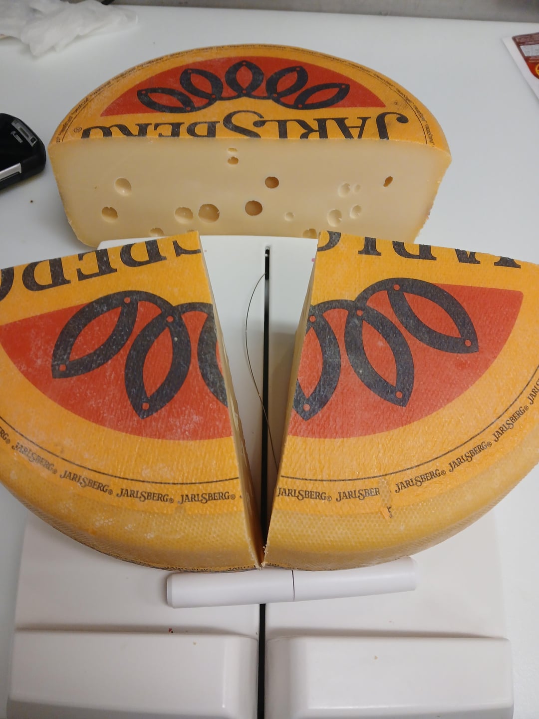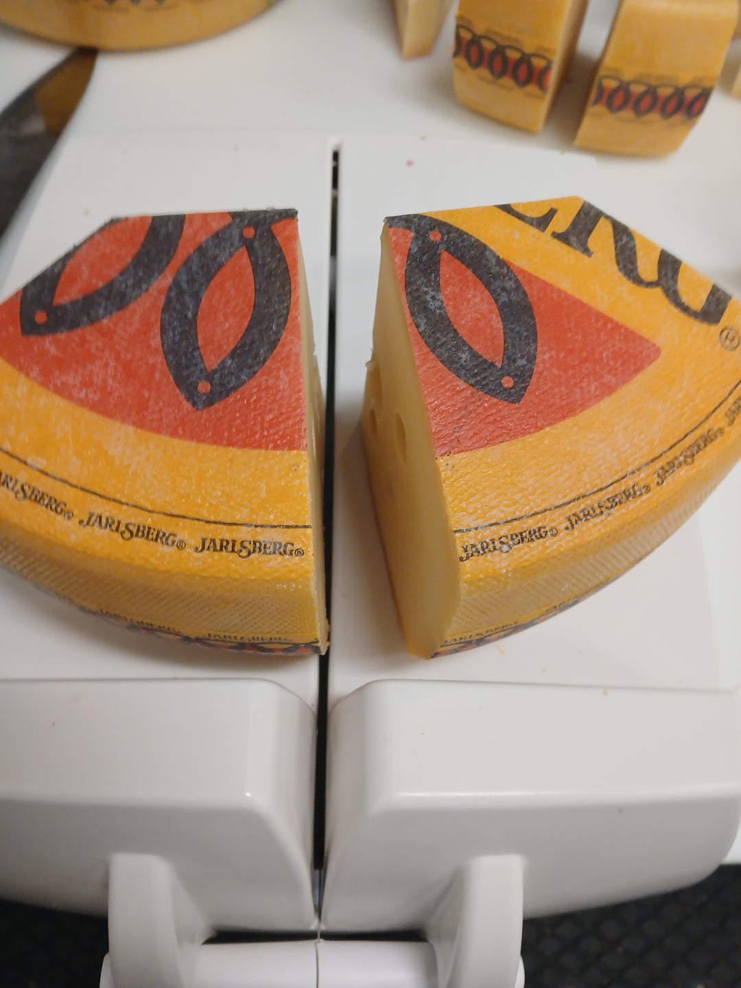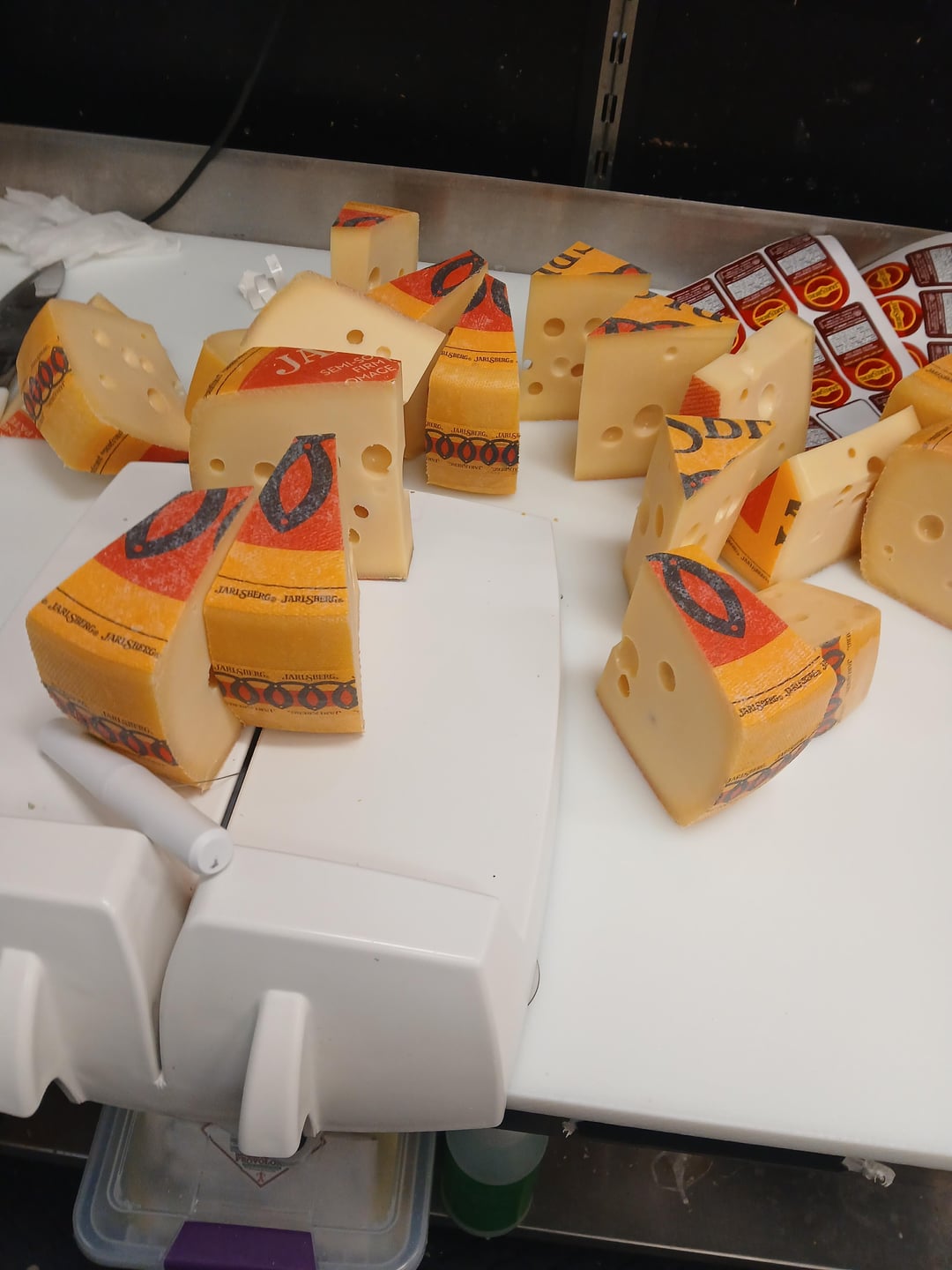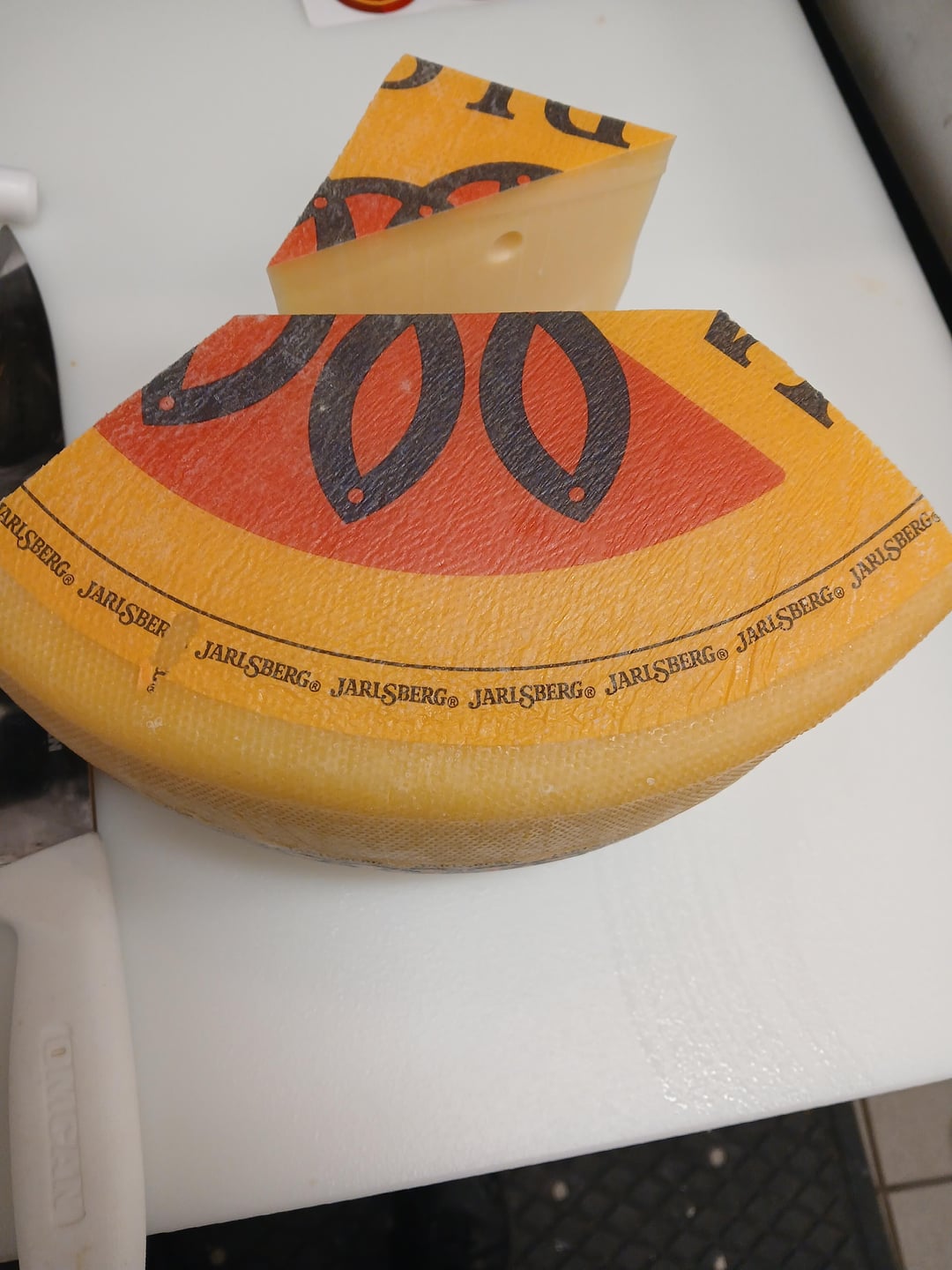 The first cheese I cut, wrapped, and displayed on my own was a Jarlsberg. I've cut so many of these that I'm basically on autopilot while doing them. This is just a quick photo spread showing the basic process. I've never bothered timing myself, but this is practically muscle memory and cutting one doesn't take long at all.