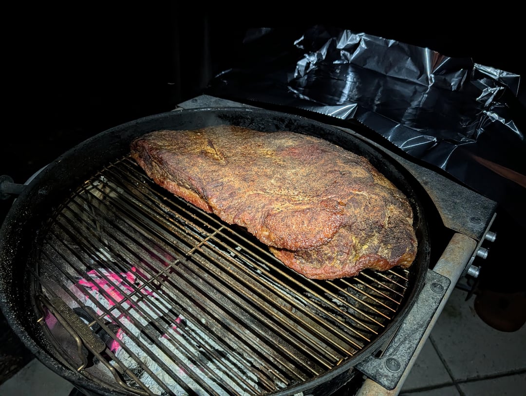 My 12th brisket. I've nailed it every time and have a pretty good process going. Smoked on the Weber for 6 hours, wrapped, popped into the oven at 250F around 11pm and went to bed. BTW, a basket of lump charcoal on the SNS can last a solid 6-7 hours if you get your air flow perfectly at 250F.