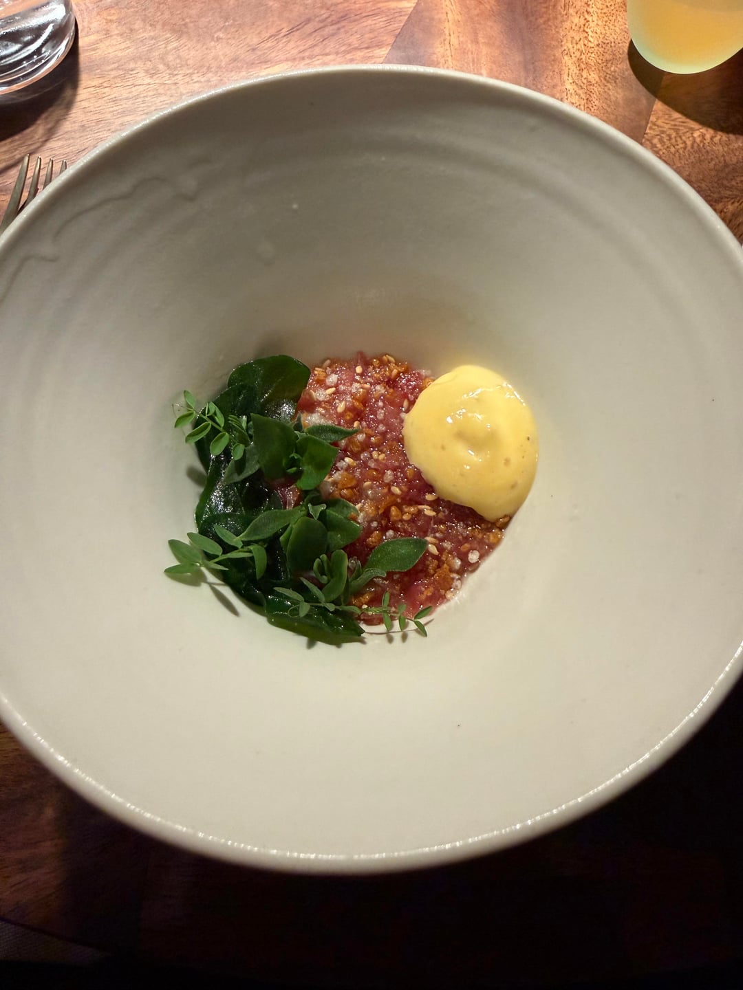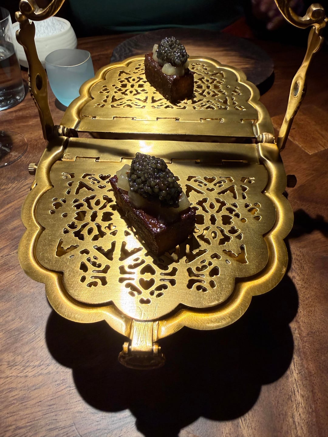 The starting bites were very good. The lobster farce in a circle is pretty incredible followed by the venison tartar, they make for a great one two punch. The next bite was forgettable, with the duck liver being overshadowed by the other ingredients, but the last small bite, a savory bread pudding with caviar and 100 year balsamic was fantastic.