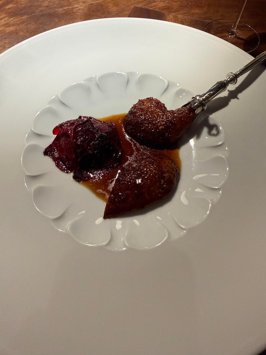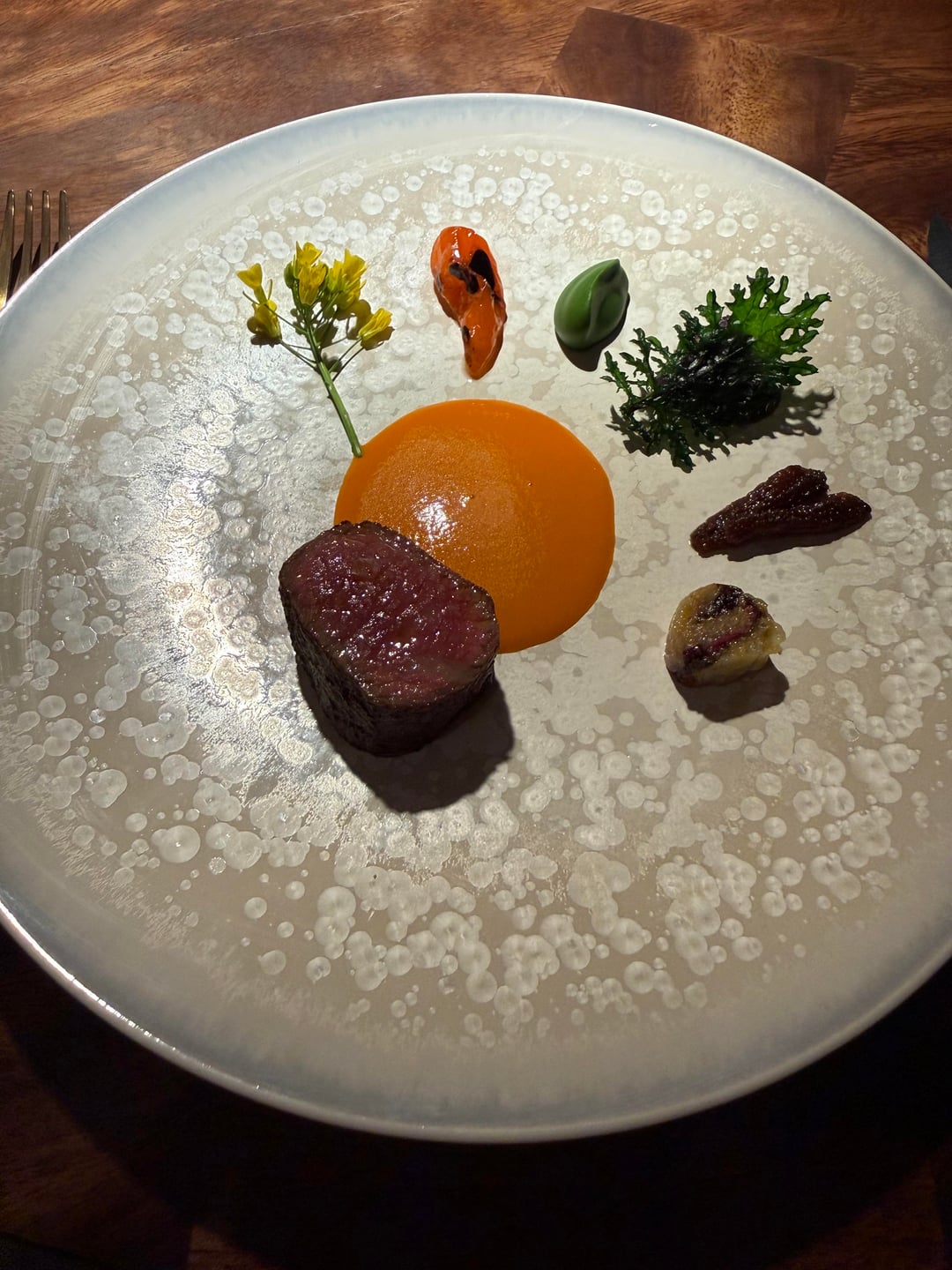 The next few dishes were great. 60 aged tuna over rice, the tuna was great with an incredible punch of tuna-ness from the age, but the rice was overcooked and mushy. The best dish of the night was the quail, served with a broth from its bones. Absolutely incredible depth of flavor here. The final savory course was beef served 3 ways, NY steak, brazola, and a small bite of short rib. All good, not great.