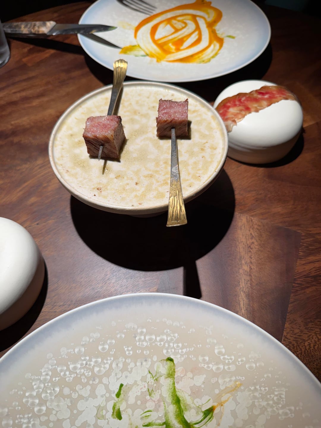 The next couple of seafood bites were pretty forgettable as well honestly. Pretty bland raw fish followed by an odd oyster course with a lot of texture, but was too sweet. Then the chawanmushi as New England clam chowder was interesting; my wife loved it but I liked the bread that came with it more. I found the “chowder” to be too salty.