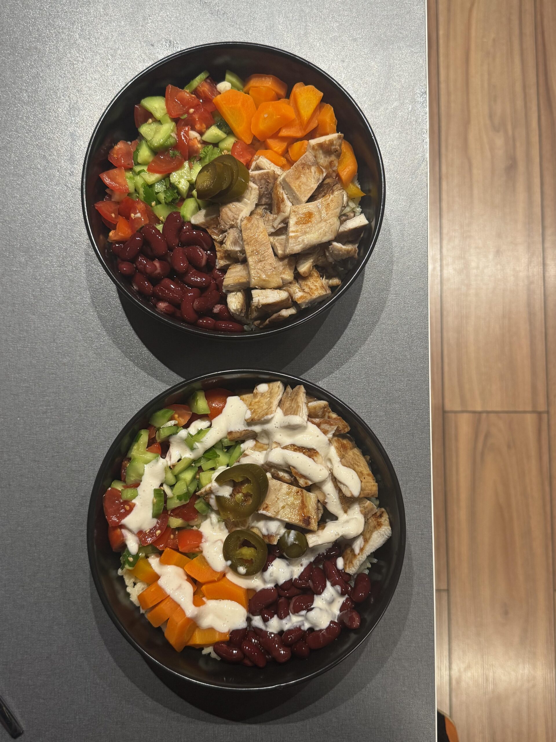 Homemade chicken bowls 🥗Grilled chicken, kidney beans, carrots, cucumber, tomato, jalapeños & garlic yogurt sauce.Simple, filling, and healthy. by unforgett4bl3c Dining and Cooking