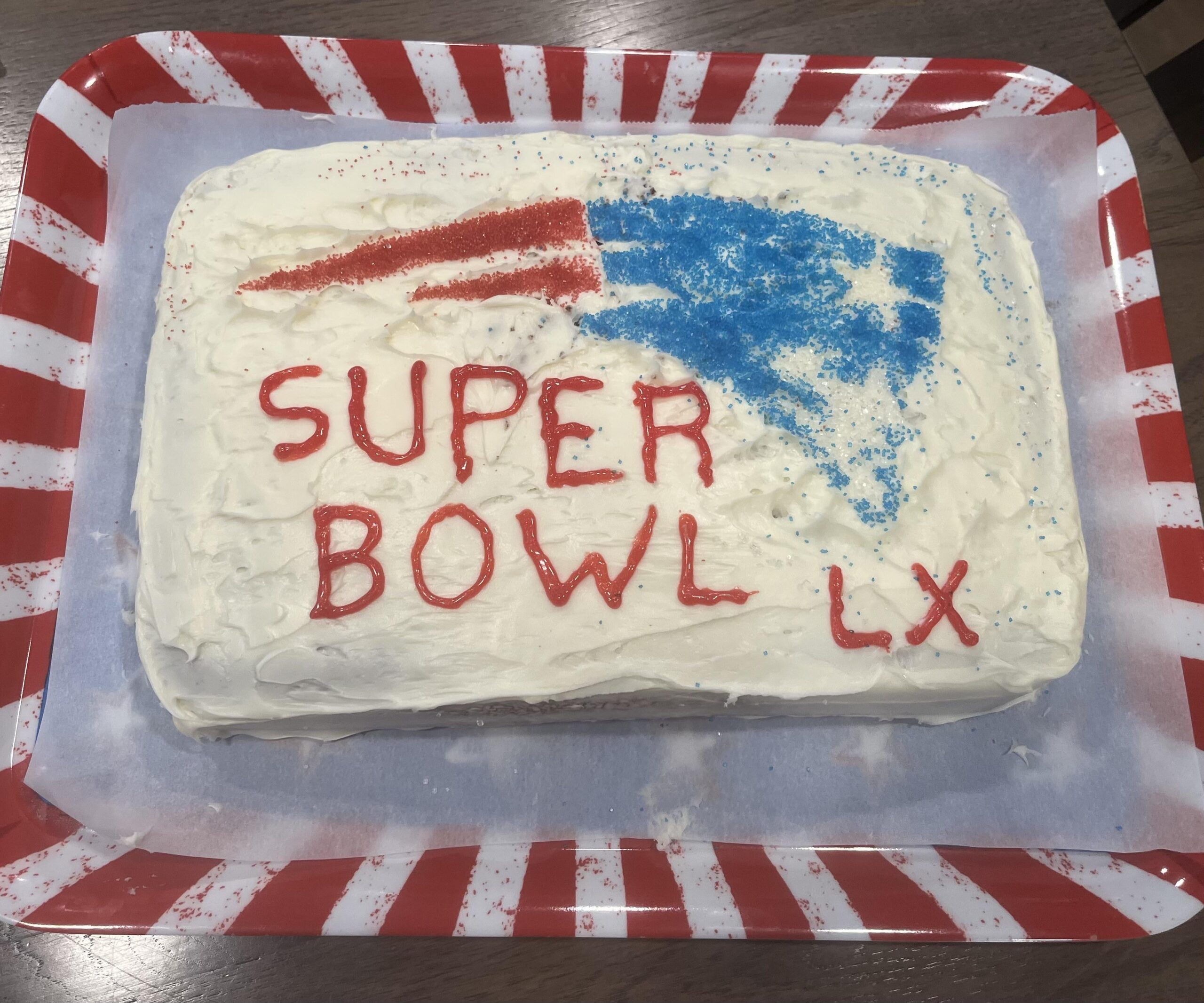 The cake itself isn’t fancy, just a chocolate boxed cake mix with premade vanilla frosting. I printed out two copies of the Patriots logo and cut out the face, star, and red stripes on one and the blue part on the other, then used them as stencils for sprinkles. Too bad they lost, but it still tasted good.