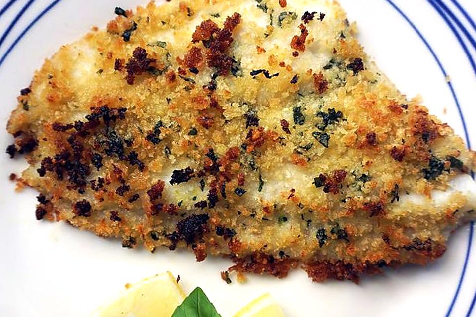 2 flounder filets, about 1 pound total 1/4 cup grated Parmesan cheese 1/2 cup coarse breadcrumbs or Italian-style breadcrumbs 1 tablespoon fresh chopped basil 1 lemon, zested (reserve the lemon) 1 garlic clove, grated 2 tablespoons olive oil