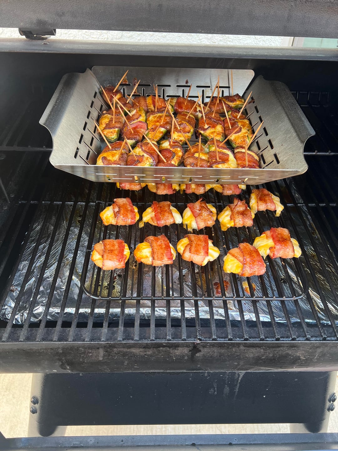 Bacon wrapped Jalapeño poppers-Hickory smoked bacon, cream cheese, Heath Riles Competition bbq rub, Colby Jack and Monterey Jack cheese.