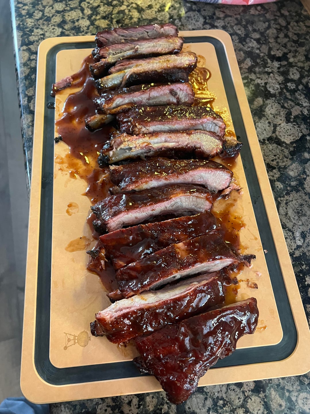 St Louis style ribs no wrap-Mustard binder, Blazing Stars Pork’n rub and Traeger Apricot bbq sauce
