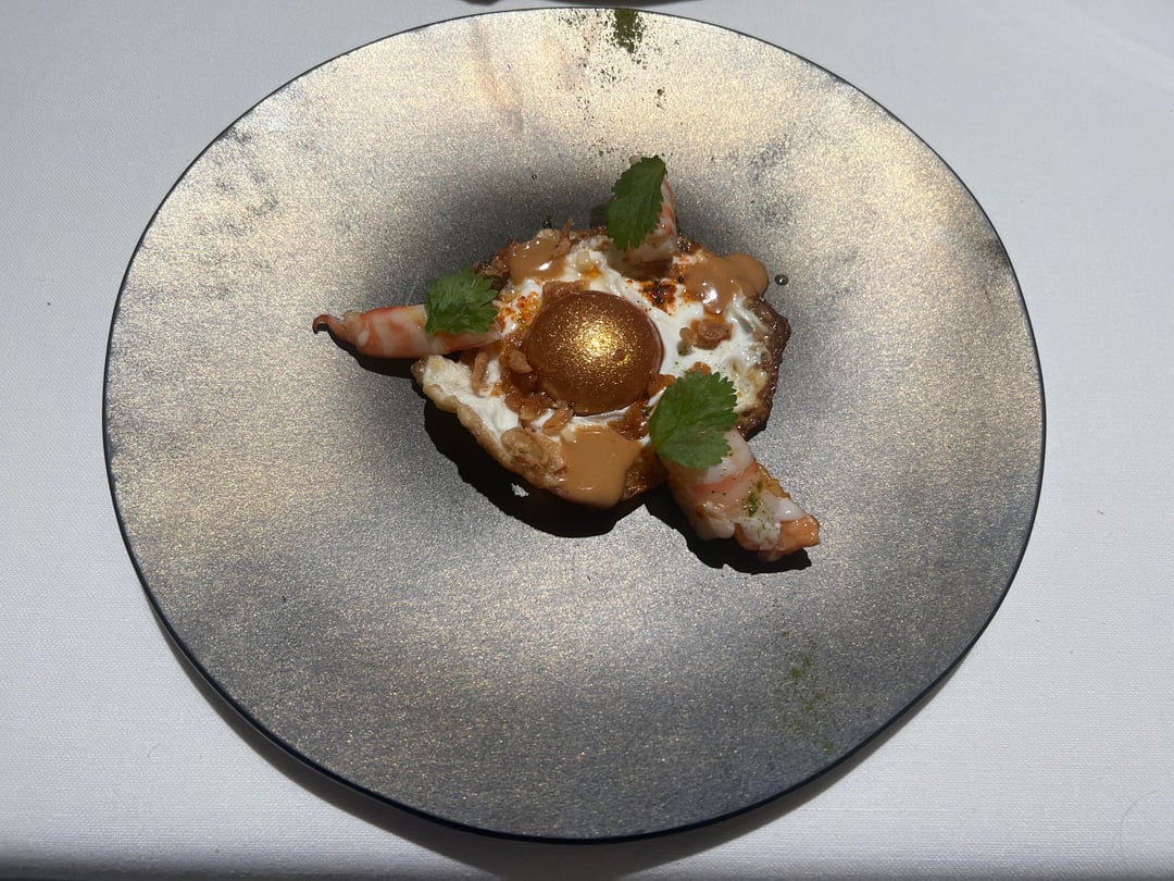 Looks like an omelette at first, but the “yolk” is actually a warm, saffron-infused crustacean jus with crispy shrimp, prawns, and Singaporean-inspired aromatics. Hot, sweet, spicy, umami — creamy and crispy textures collide in a truly unforgettable bite.