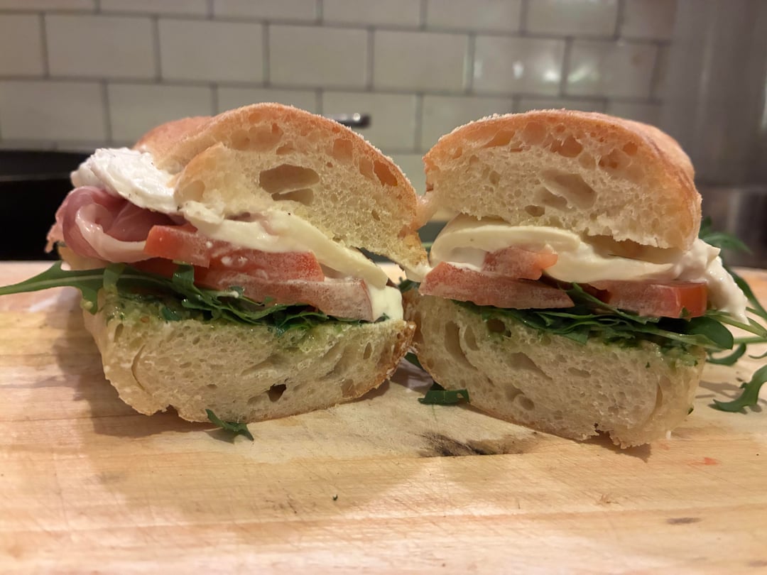 Made some baguettes and decided to make a sandwich with homemade pesto, arugula, tomatoes, Serrano ham (on one side) and burrata