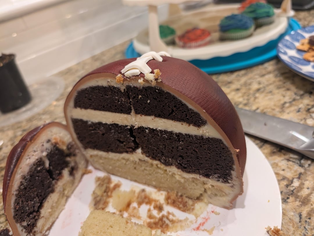 Luckily I had some mystery cakes in the freezer. The hemisphere cake was devils food, the 8″ cake was a pre-partially carved already vanilla buttermilk cake. The bottom square turned out to be cornbread lol so I had to put that back in the freezer.