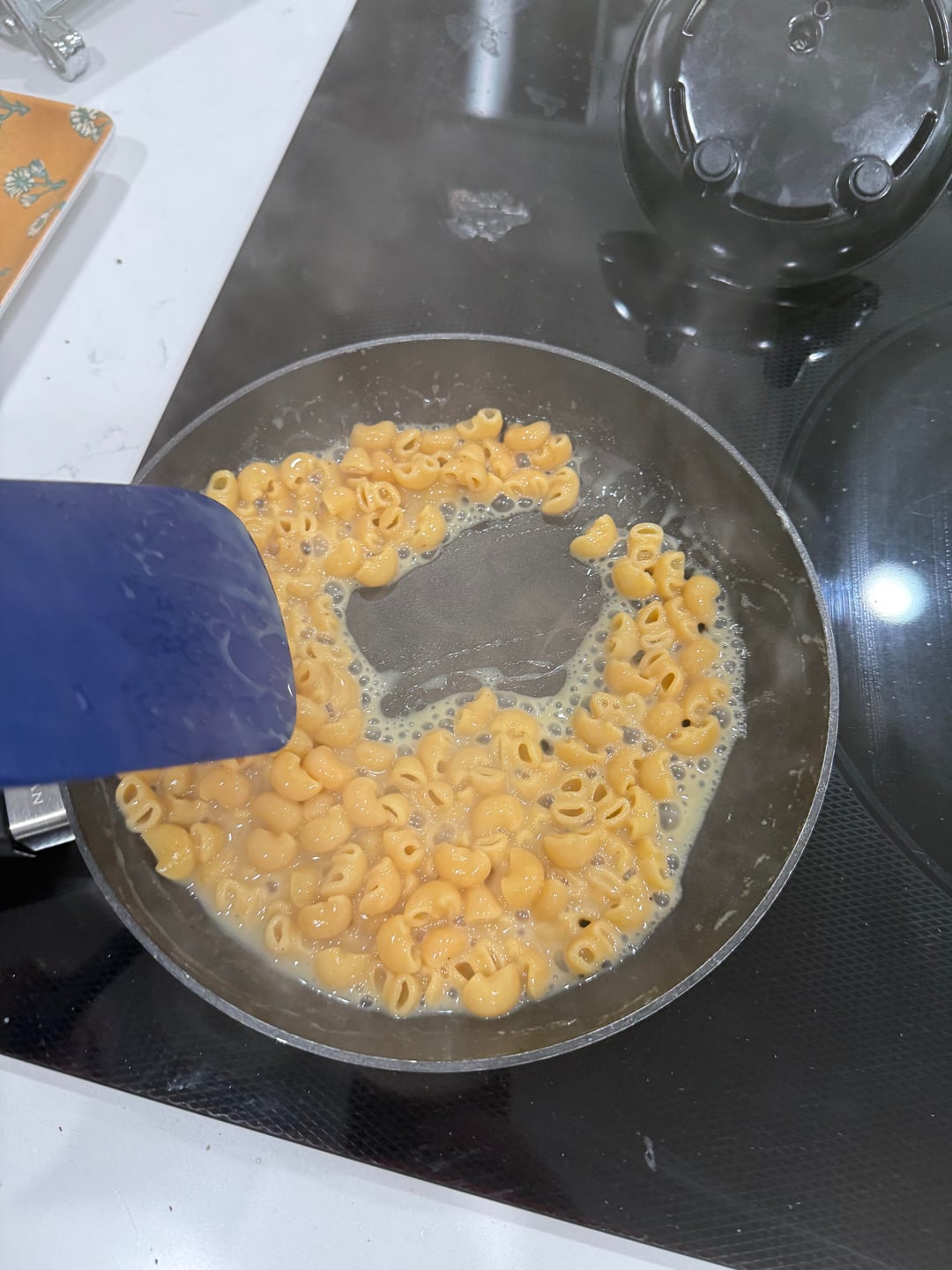 Take the pasta off the heat. It needs to cool before the final mix. Give it 2-3 minutes to cool before proceeding. If you have a laser thermometer or something similar wait until the temperature is at 150F.