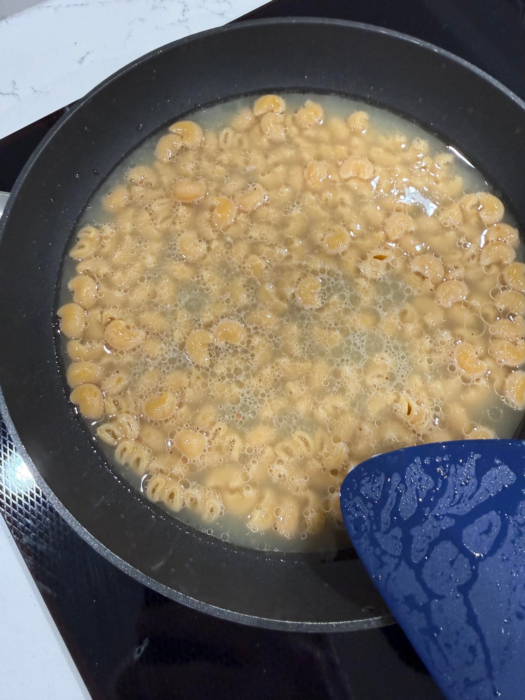 Add the pasta and bone broth into the skillet and put it on high heat. The liquid should just cover the pasta (pic 2). Cook it until almost all the liquid is absorbed (see pic3).